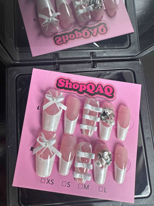 Ballet on Your Fingertips | Handcrafted Press-On Nails – Pure Desire, Brightening, Removable Bowknot Design