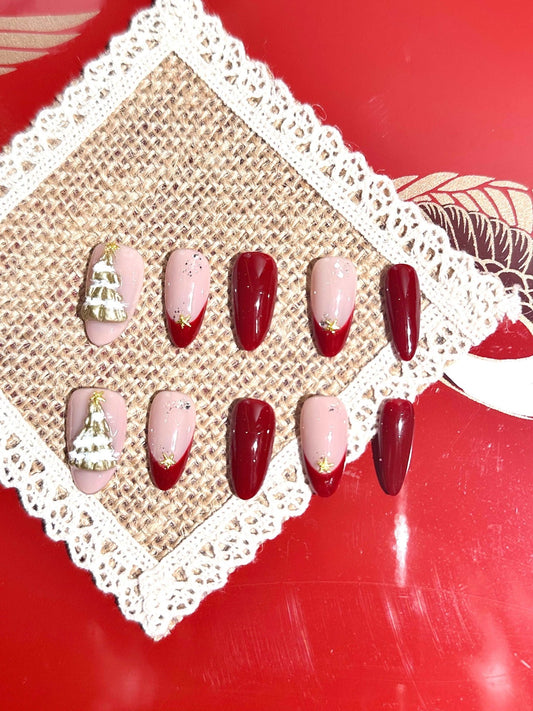 Christmas Santa & Christmas Tree Hand-Painted Press-On Nails