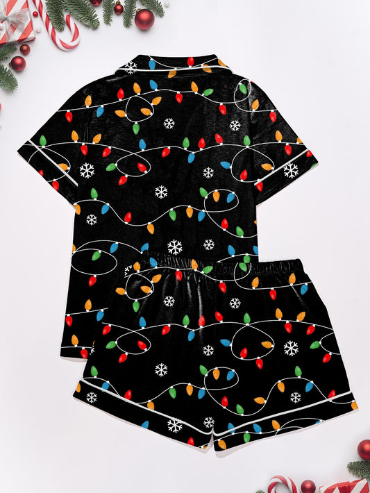 Holiday Lights Short Pajama Set — Black Festive String-Light Print Short-Sleeve Top & Shorts