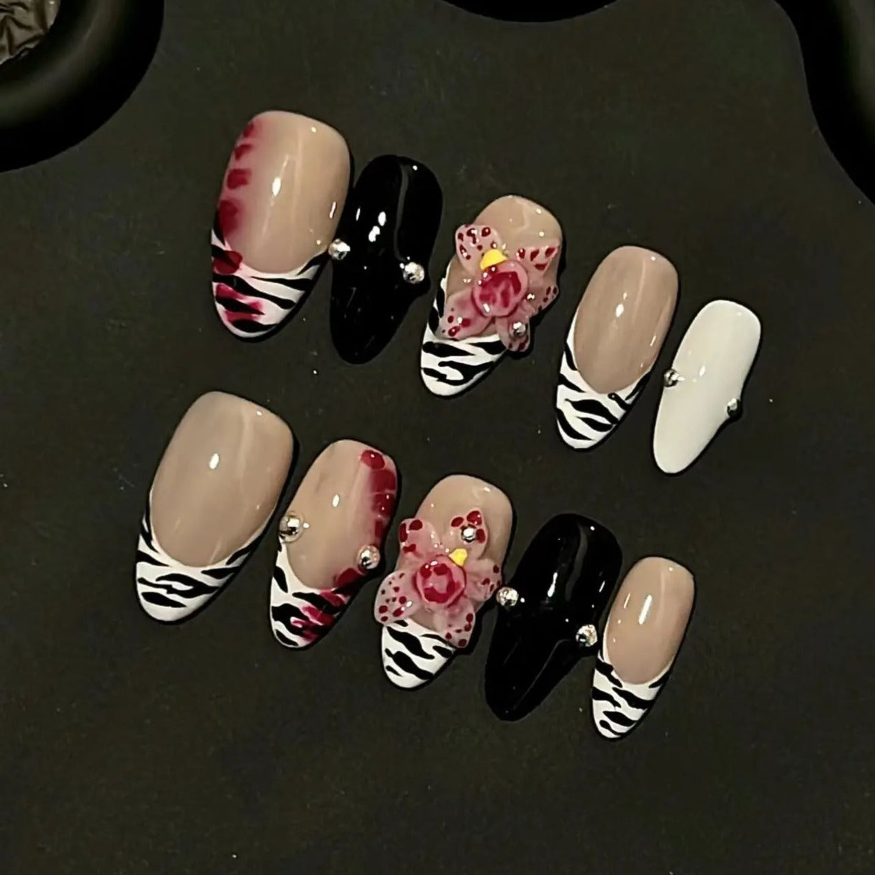Elevate your nail fashion with our Zebra Print French Tip Hand-Painted Glamour Nails. These high-end, 3D Flower Detachable Handmade Nail Art pieces are meticulously crafted to offer a unique and stylish look. Perfect for fashion enthusiasts, these nails combine sophistication and trendy design, making them ideal for any occasion.