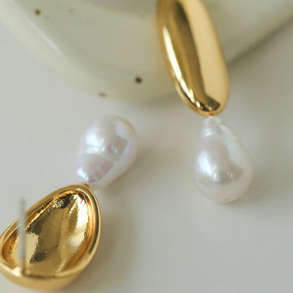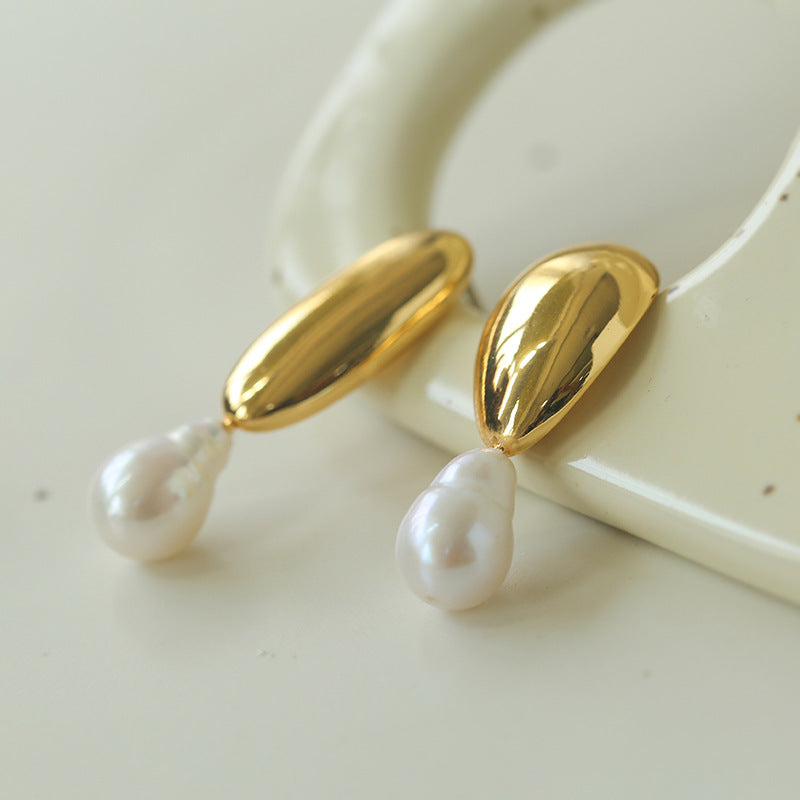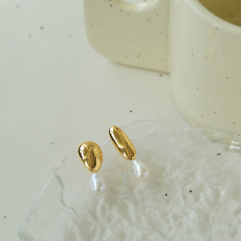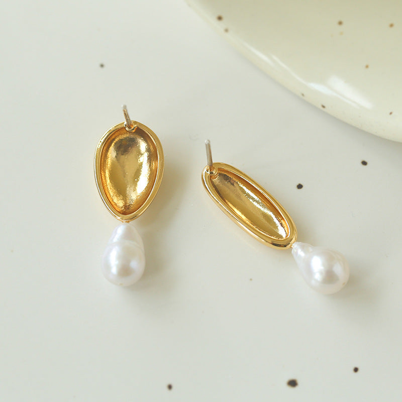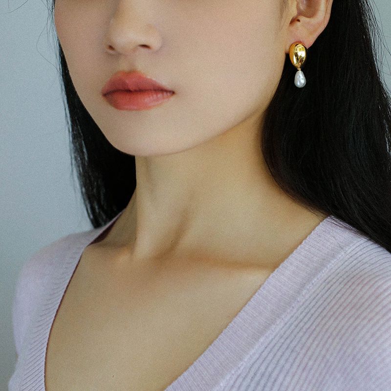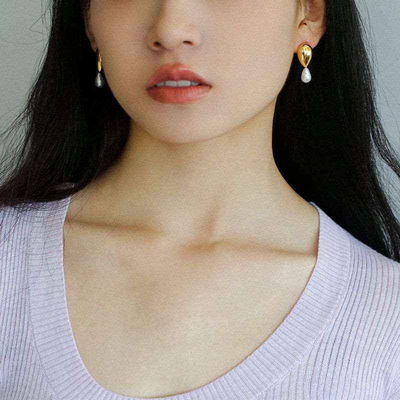 Asymmetrical metallic elements paired with teardrop-shaped natural pearls evoke an unmistakable sense of French elegance. The delicate and velvety luster of the pearls complements a gentle temperament, exuding an aura of refinement. The combination exudes simplicity and understated sophistication, offering endless possibilities for styling.