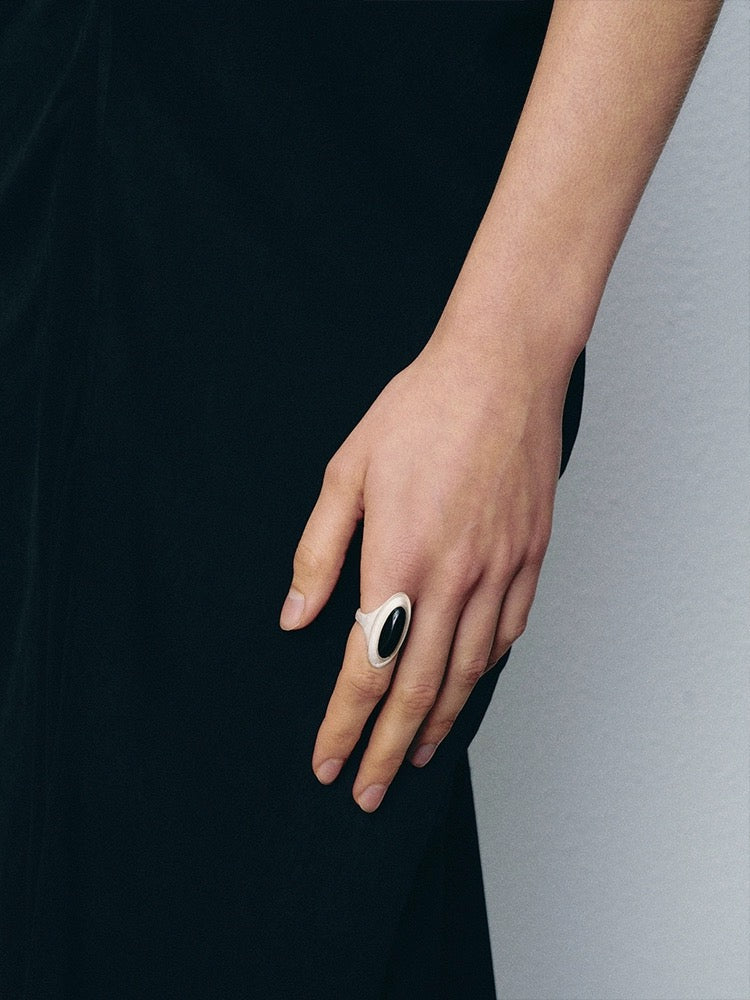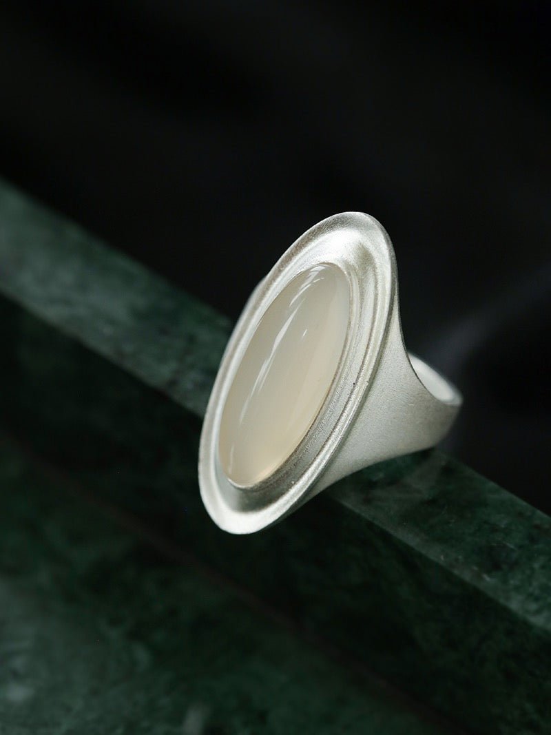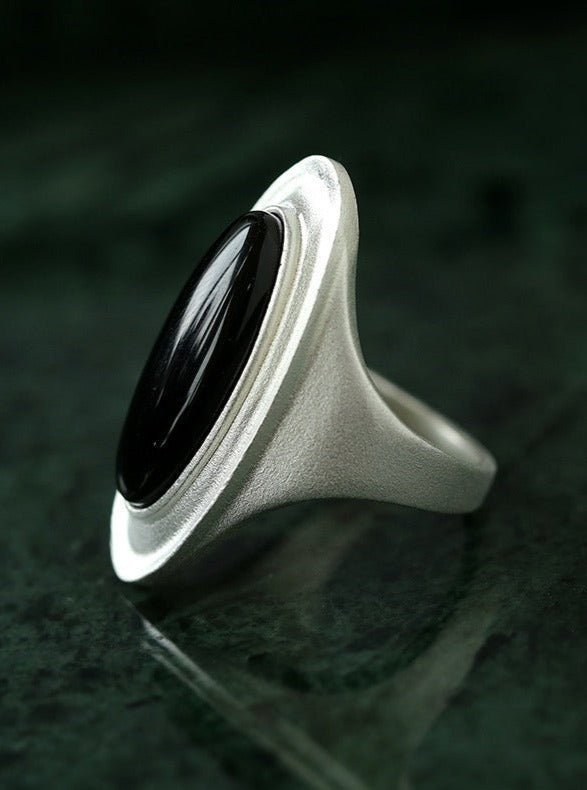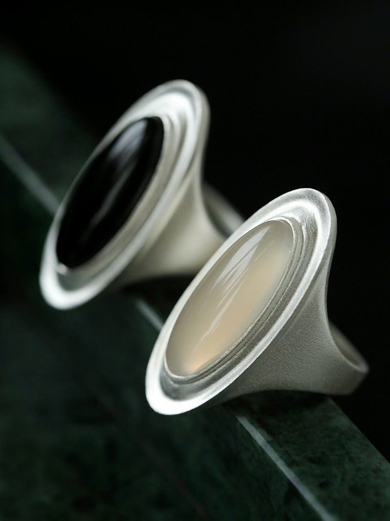 925 Sterling Silver Matte Black Agate and Gray Jade Oval Ring