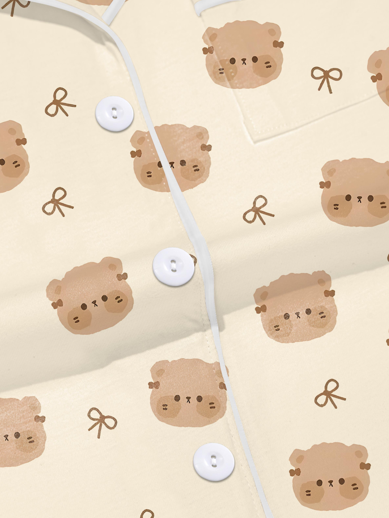 Cream Teddy & Bow Modal Pajama Set — Short Sleeve Button‑Up Top + Elastic Shorts