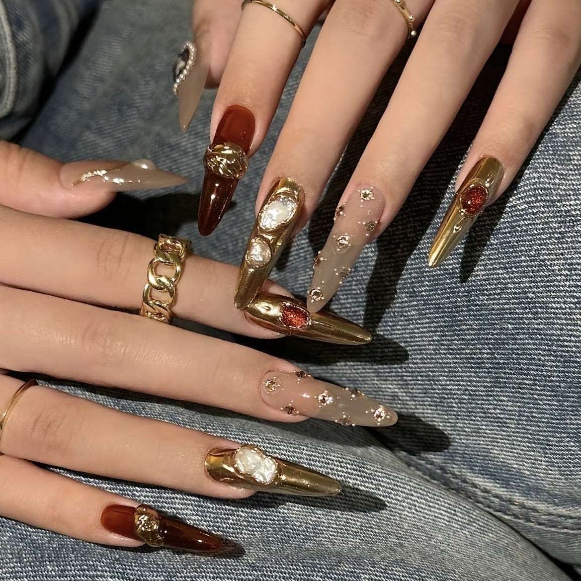 Step into luxury and elegance with our "Crimson" Baroque Mélange Wearable Nail Art collection. Embrace the opulence of the Baroque era and elevate your style for the autumn/winter season with these exquisite handcrafted nail art pieces.