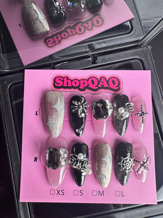 Vintage Gothic Nail Art | Sweet & Edgy Dark Aesthetic with Silver & Black Spider Skull Design | Handmade Medium-Length Press-On Nails