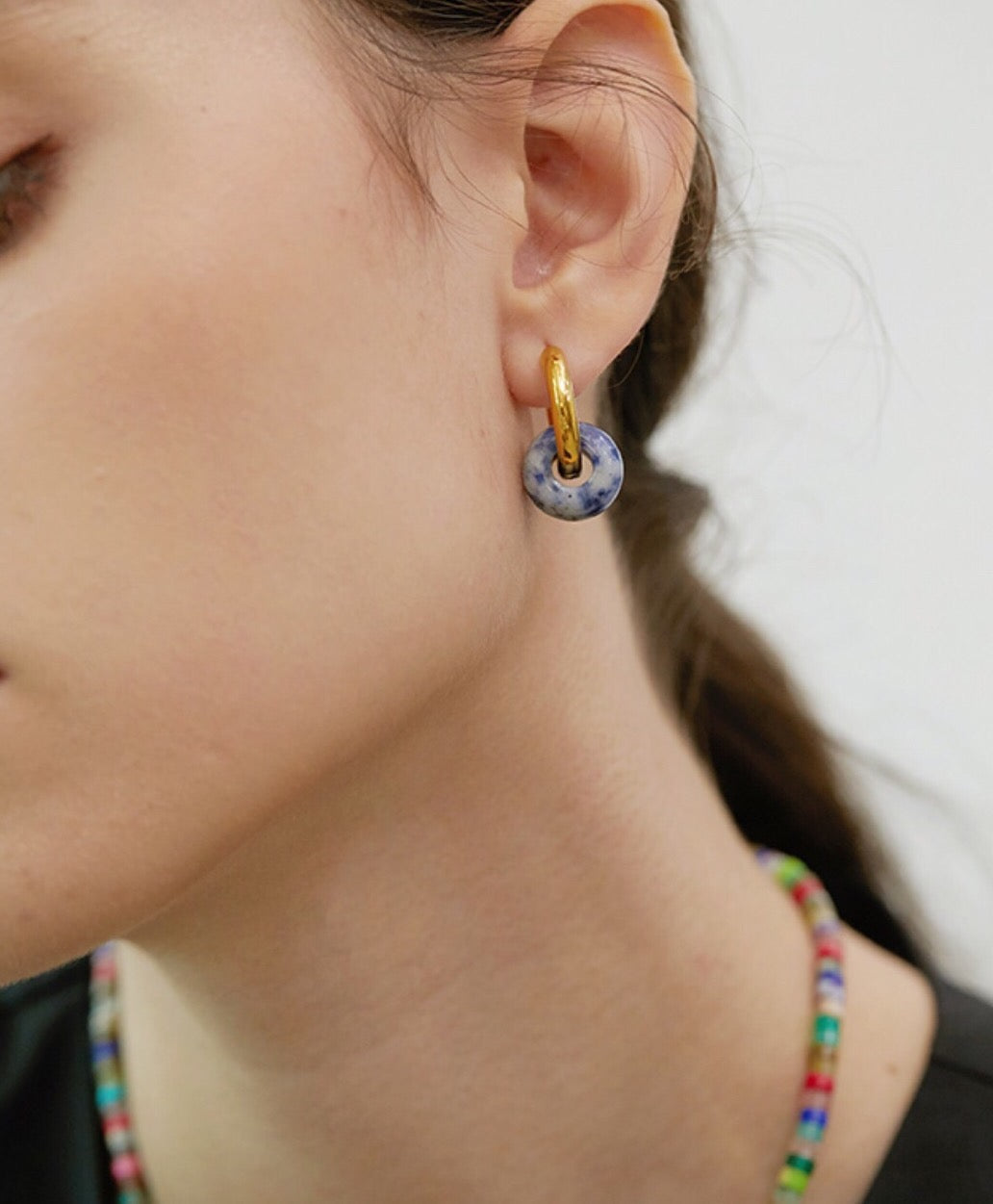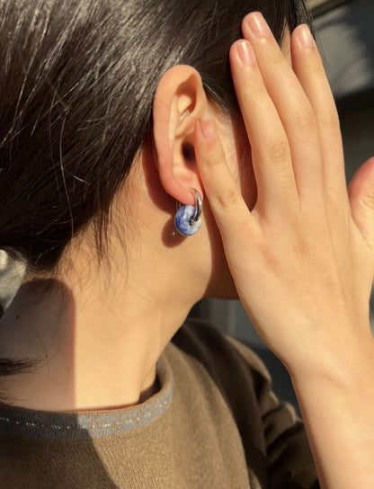 Handcrafted with love and attention to detail, these chubby and sweet donut-shaped earrings radiate a sense of sophistication and natural charm. The earthy tones of blue, green, gray, and black effortlessly blend, creating an aura of nature's magnificent beauty.