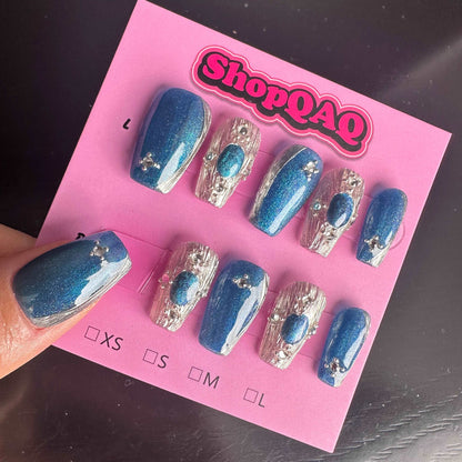 Discover timeless elegance with our "Buccellati" Handcrafted Short Press-On Nails. Featuring a stunning lake blue cat eye gemstone design, these nails blend vintage charm with a sophisticated touch. Perfect for summer, they offer a high-end, retro aesthetic that enhances any look. Handcrafted with precision, these nails provide a unique and luxurious finish, making them an essential addition to your nail art collection.