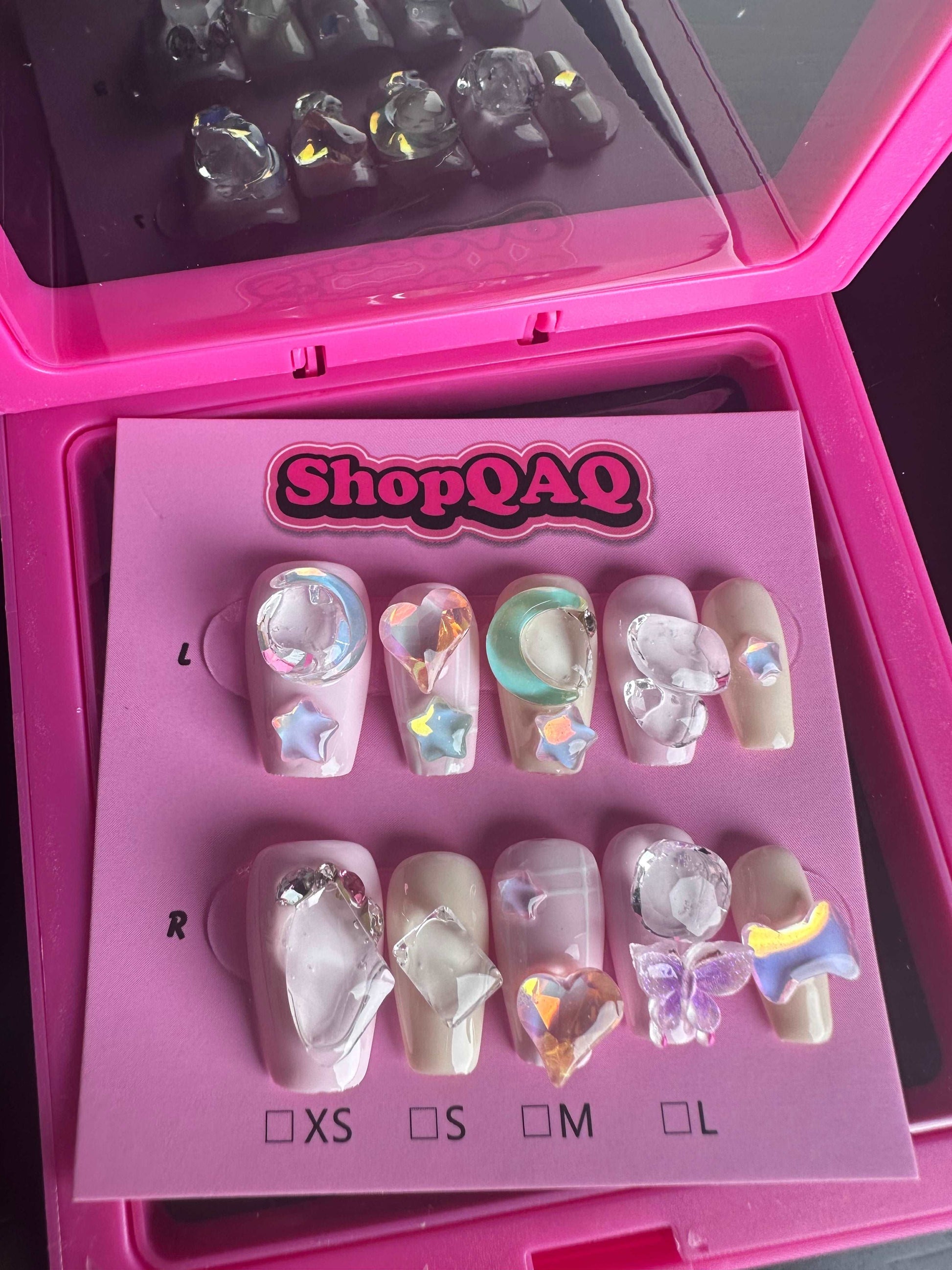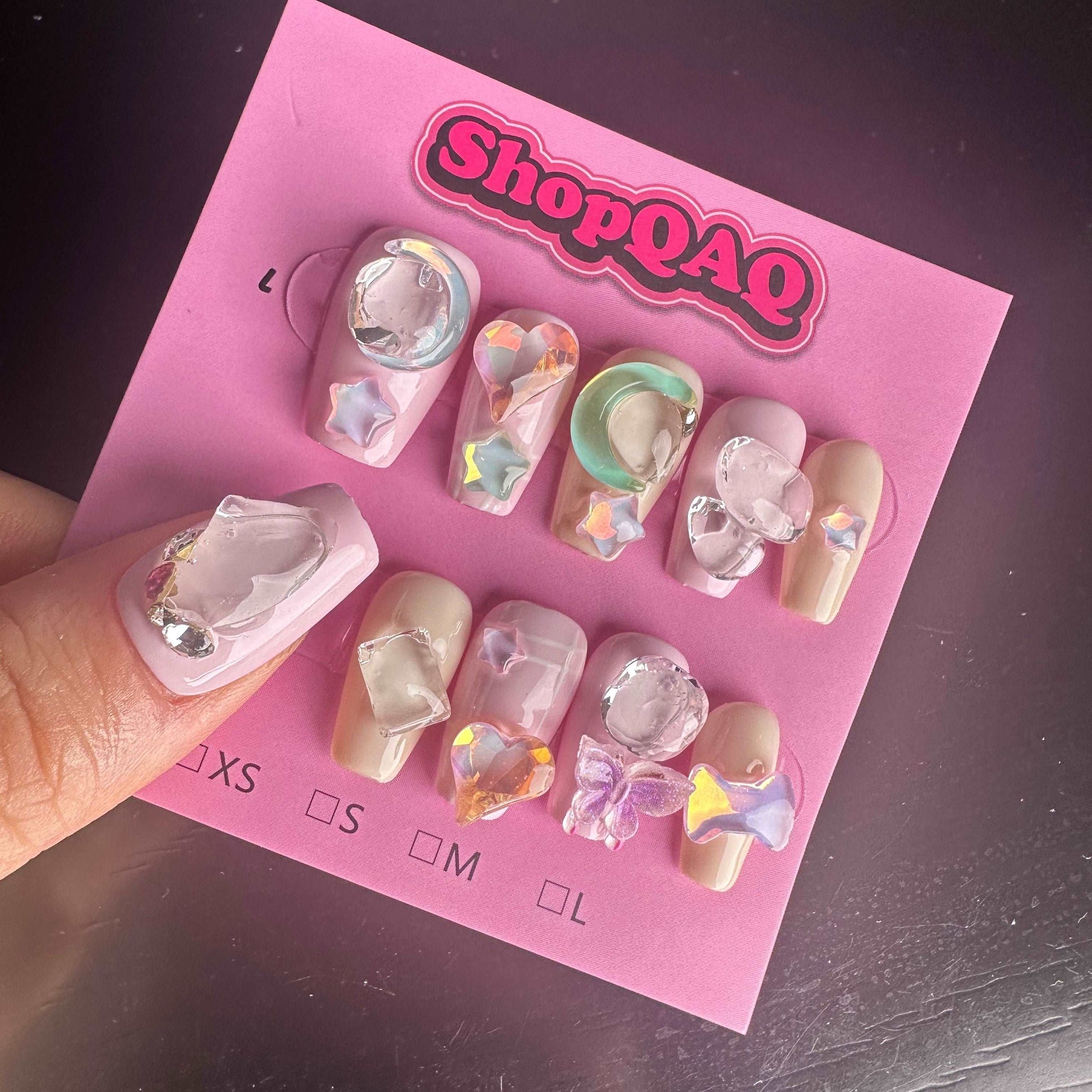 Indulge in the playful charm of our Candy House/Spicy Sweet Pink Star & Moon Handcrafted Press-On Nails. These delightful nails are designed with a whimsical, hand-painted theme that captures the innocence and joy of youthful days. Featuring a sweet pink base with adorable star and moon motifs, this nail art is perfect for anyone who loves a touch of girlish fun and creativity.