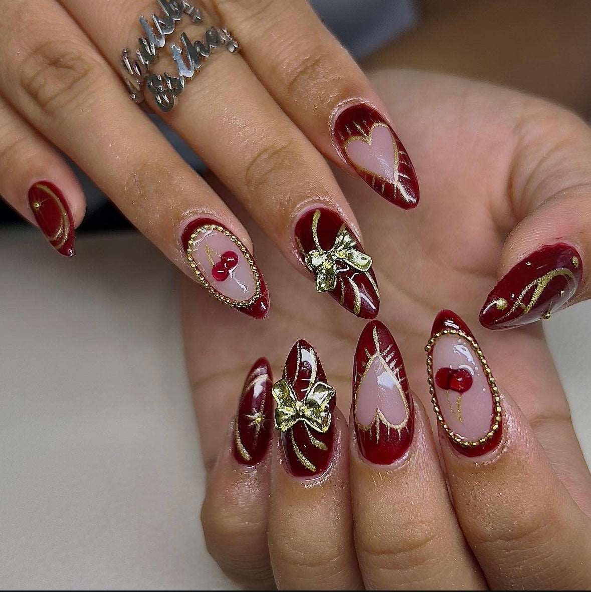 Get ready to fall in love with our Cherry Heart Bowknot French Tip Style Press On Nails! These nails are perfect for adding a touch of elegance and charm to any outfit. The cherry heart design is both unique and eye-catching, while the press on feature allows for easy application without the hassle of a salon visit. Make a statement and take your nail game to the next level with our Cherry Heart Bowknot French Tip Style Press On Nails!