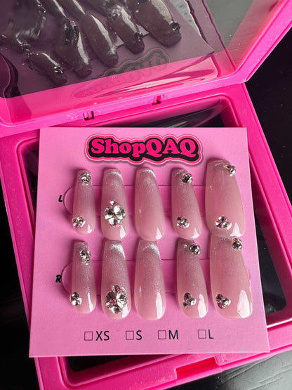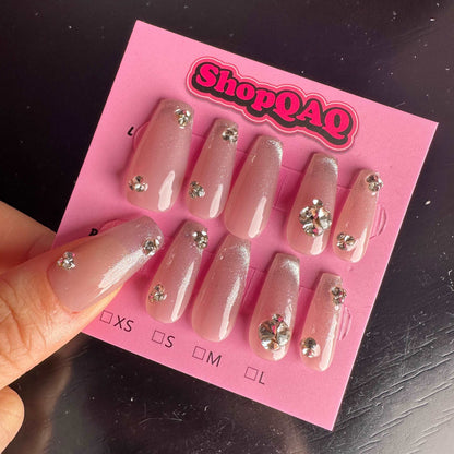 Enhance your look with our Custom Handcrafted Press-On Nails, featuring a stunning cat eye effect and sparkling diamond accents. Perfect for brides, mothers-to-be, or anyone seeking a touch of elegance, these nails combine luxurious design with practical functionality. Made from high-quality gel, they are easy to apply, removable, and suitable for all occasions.