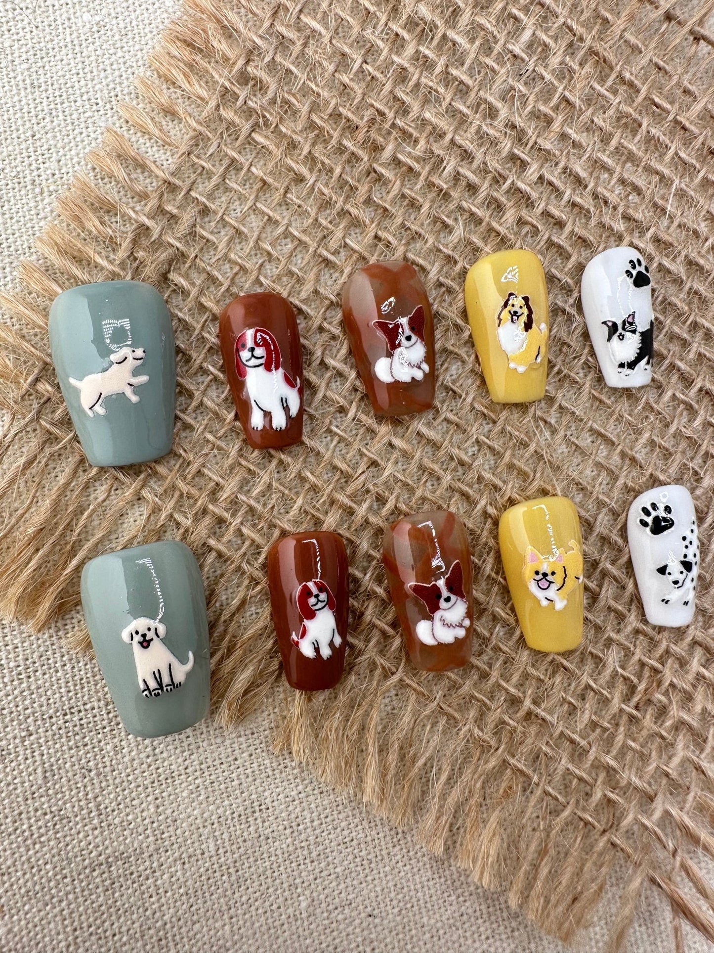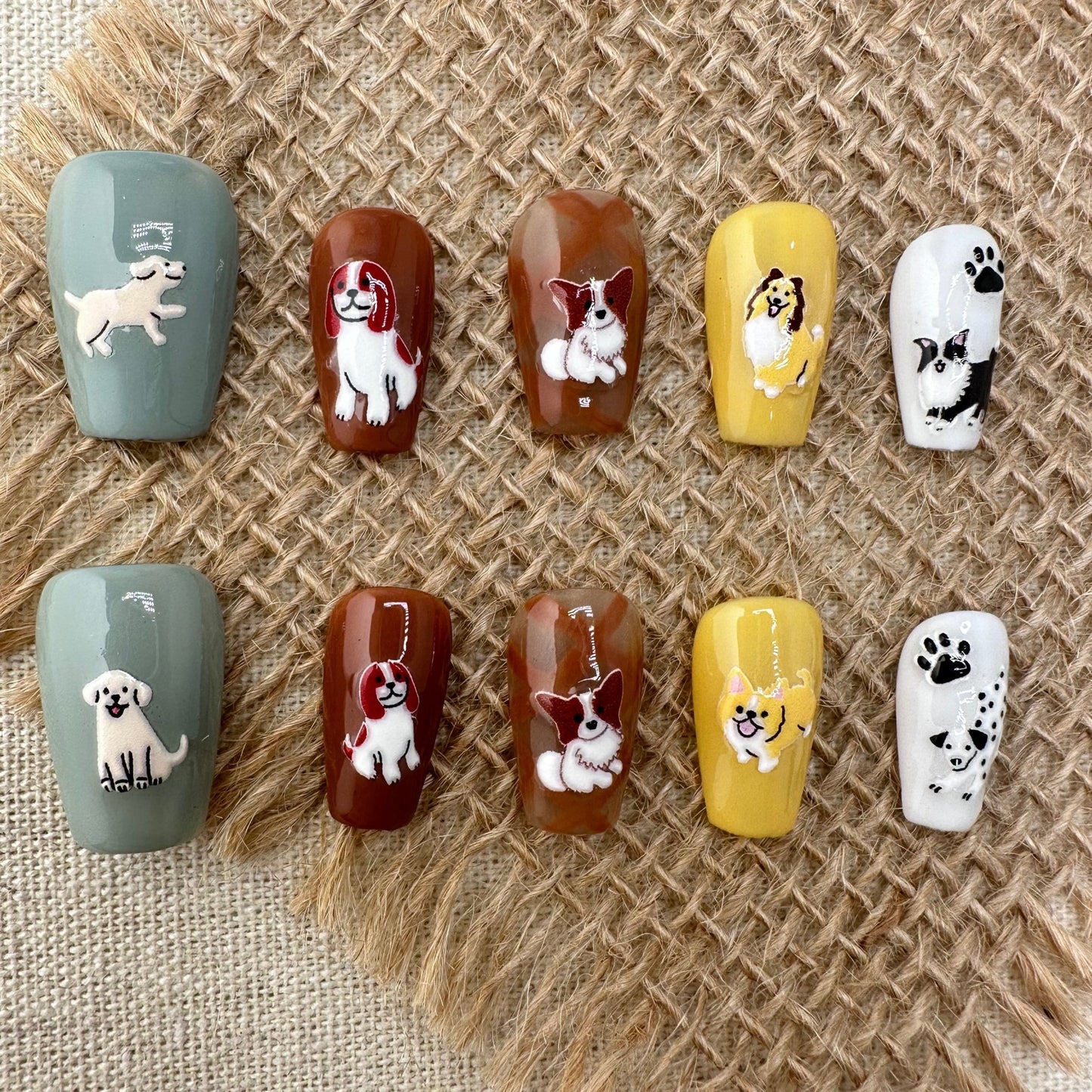 Hand-Painted Cute Dog Press-On Nails with Multicolor Base
