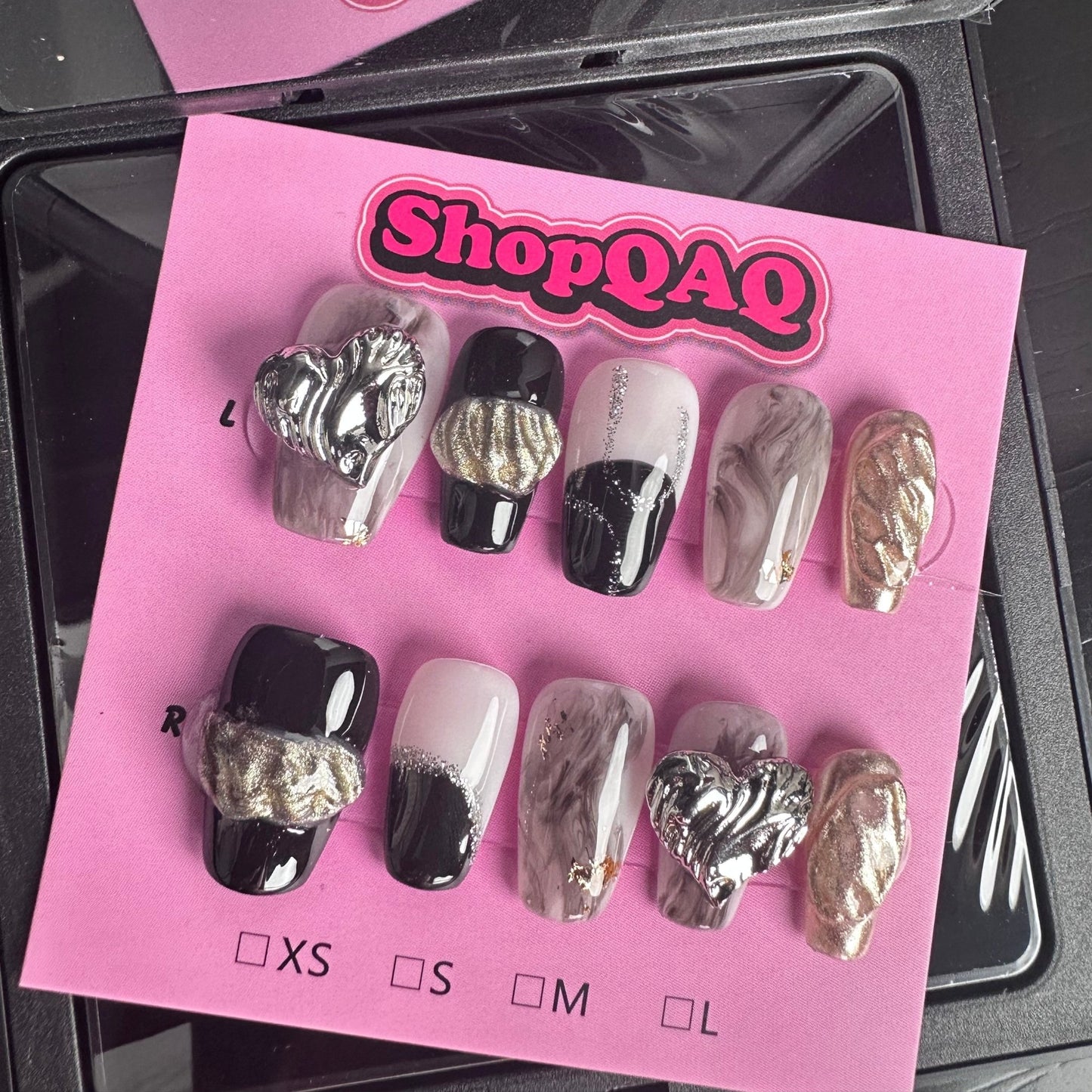Product Overview: Introducing the Heart Crystal Nail Art, a stunning blend of elegance and sparkle designed to captivate and impress. These press-on nails feature a unique combination of heart-shaped crystals and ink-inspired black designs, creating a bold and sophisticated look that’s perfect for the modern fashionista.
