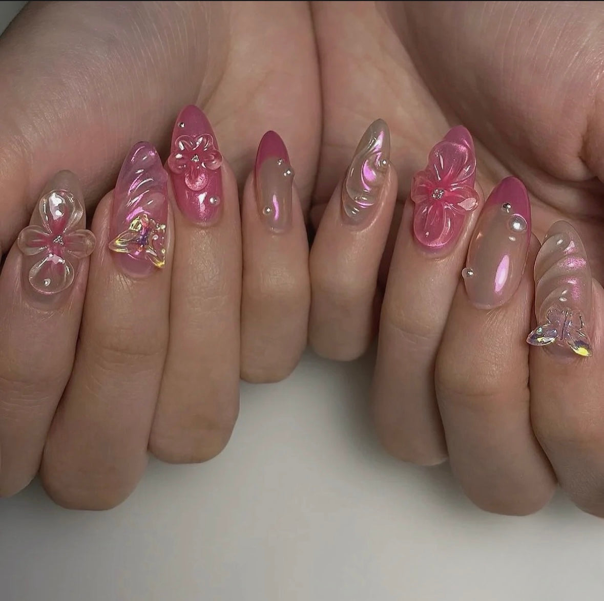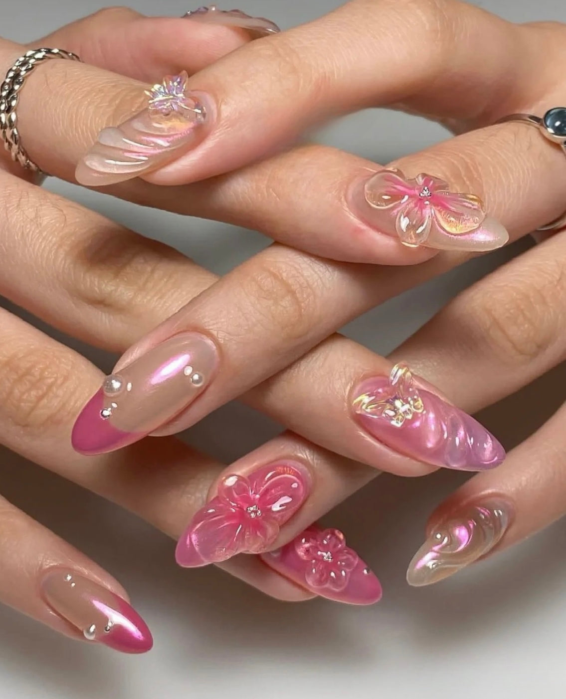 Pink Aurora Crystal 3D Flower Nails - Deluxe Detachable Handmade Nail Art