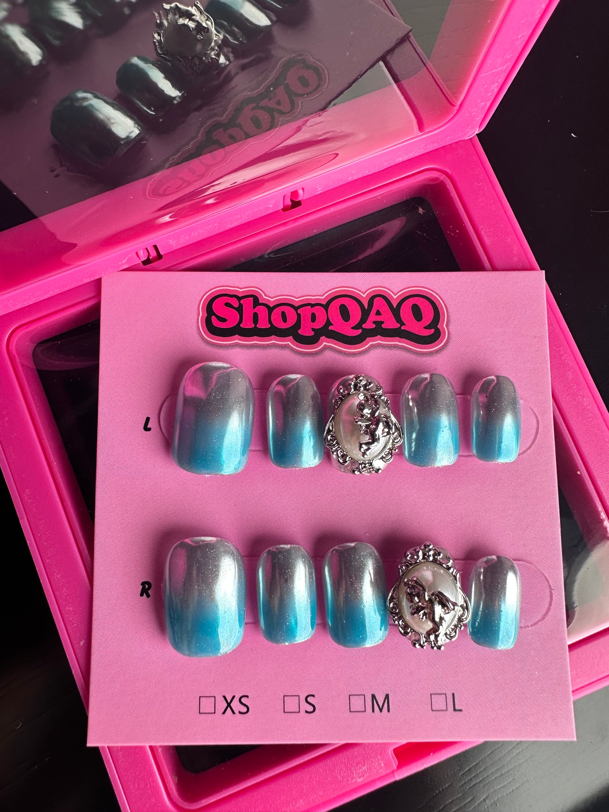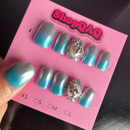 Elevate your nail game with our Handcrafted Silver Blue Icy Gemstone Mirror Powder High Shine Press-On Nails. These luxurious, detachable handmade nail art pieces feature an exquisite combination of silver and blue tones with a stunning icy gemstone effect. Perfect for adding a touch of elegance and sophistication to your look, these nails are ideal for any special occasion.