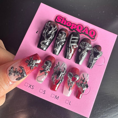 Yabi Culture Gothic Press-On Nails | Handcrafted Y2K Demon Spider Skull Dark Punk Removable Nail Tips