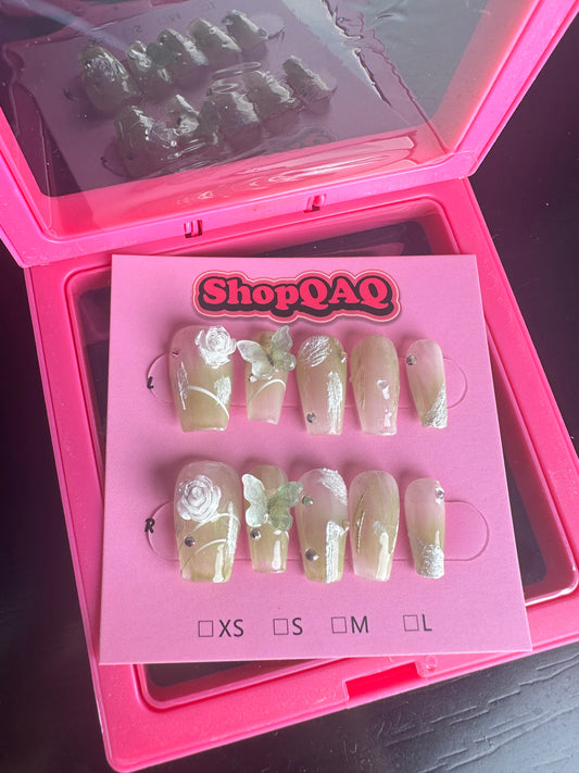 Enchanted Forest Press-On Nails - Spring/Summer Brightening Hand-Painted Gel with Clear Gradient