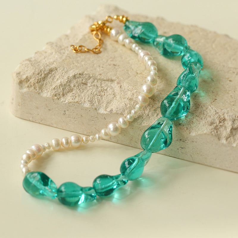 The necklace features irregularly shaped natural pearls and handcrafted glass with a gradient effect, creating a statement piece that is not overwhelming. The blue hue is simply stunning and evokes images of the ocean.