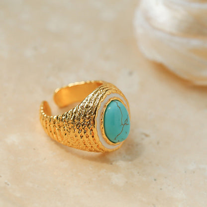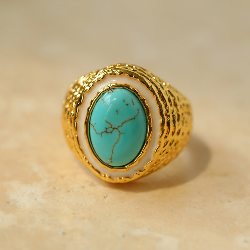 French Exotic Elegance: Blue-White Enamel Natural Stone Ring