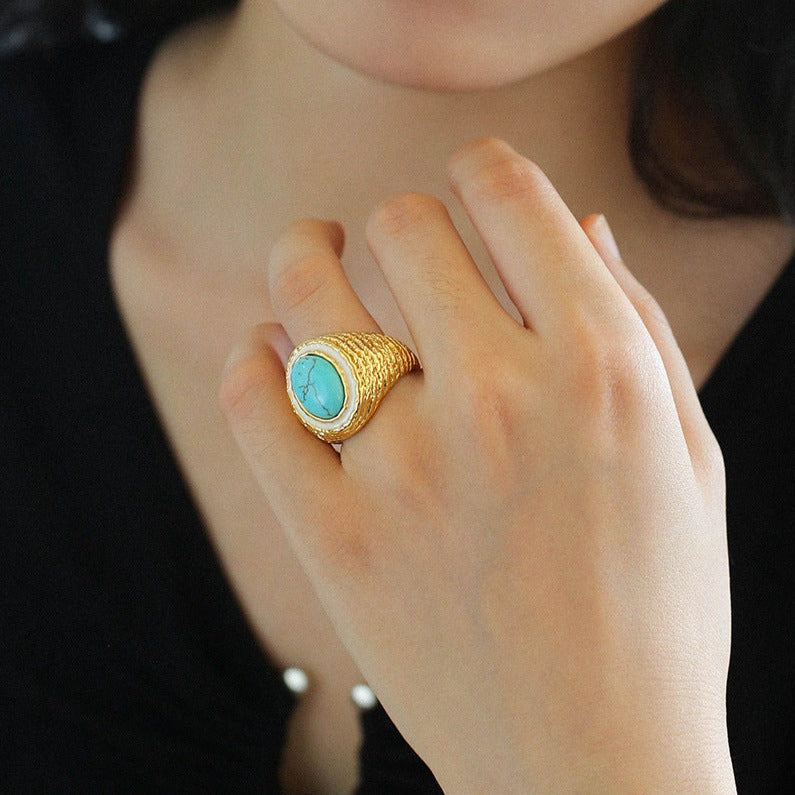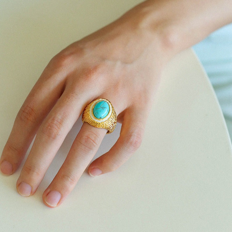 Descriptionï¼?br> This ring exudes a captivating vintage charm with its blend of gold and natural gemstone in a Baroque style. Adding a touch of exotic allure to this vintage piece is a stunning azure fir-colored natural gemstone, meticulously showcasing its primordial growth patterns. The gemstone is adorned with a delicate fusion of milky white and soft blue enamel, creating an artful juxtaposition.