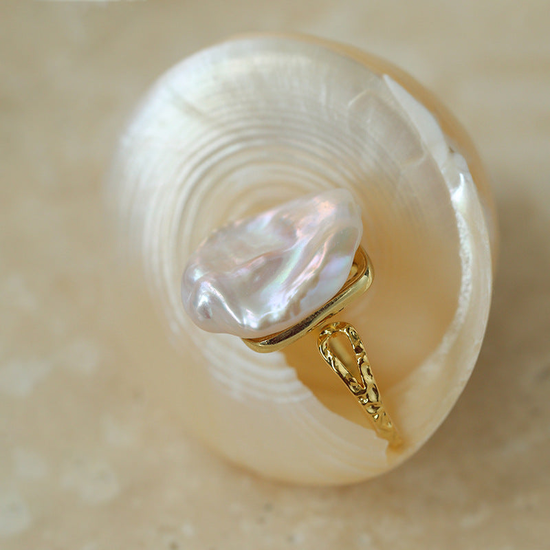 Standing approximately 1.3 cm tall, the ring highlights the vibrant beauty of Baroque pearls while maintaining a sophisticated look.
