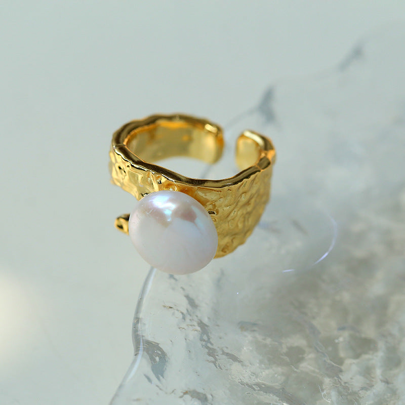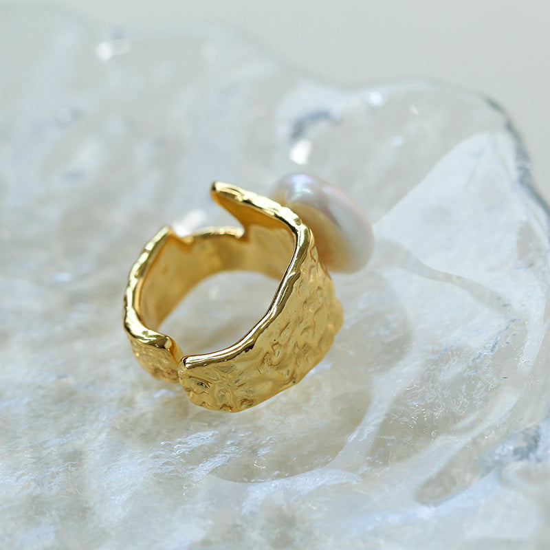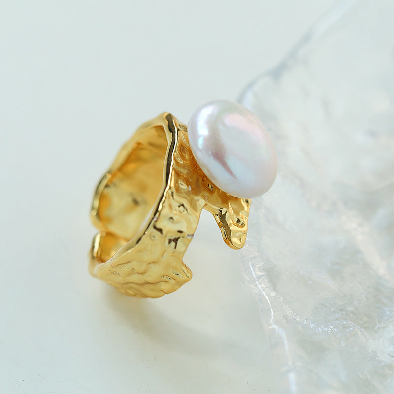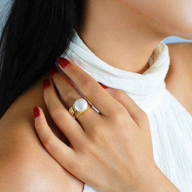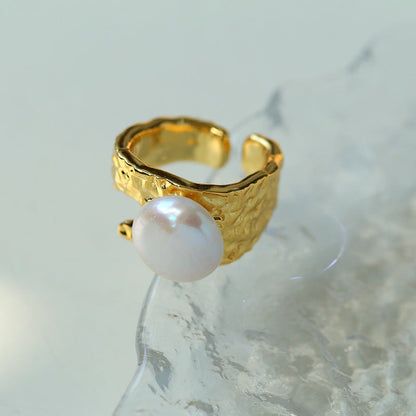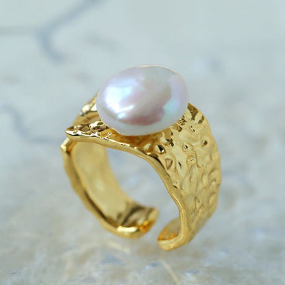 Cleverly combining 18K gold plating with natural 13mm baroque pearls, this ring is the perfect blend of vintage charm and modern style. Its flat, round design blends perfectly with freshwater pearls to create a sophisticated statement ring.