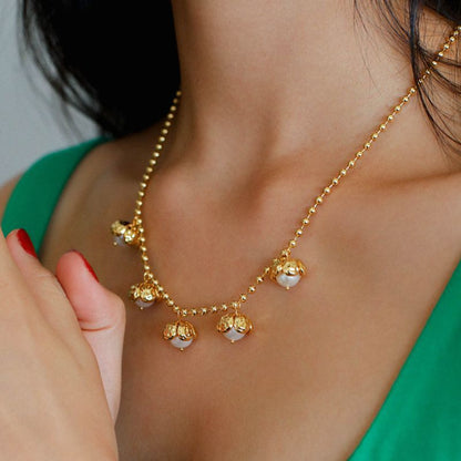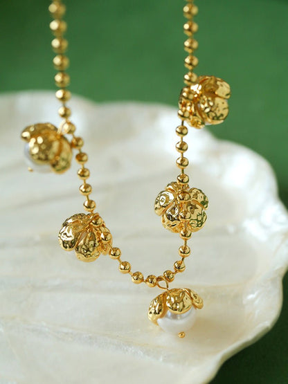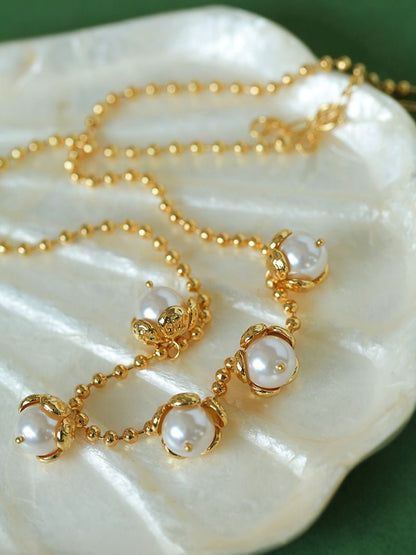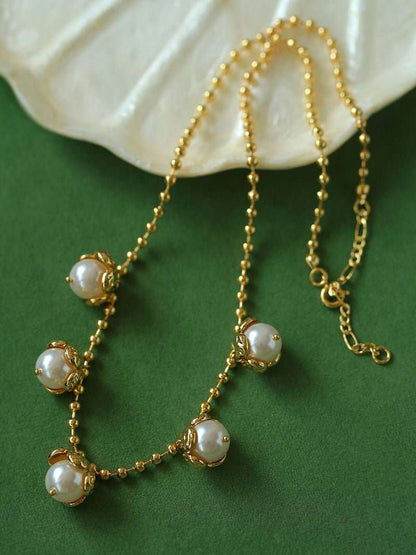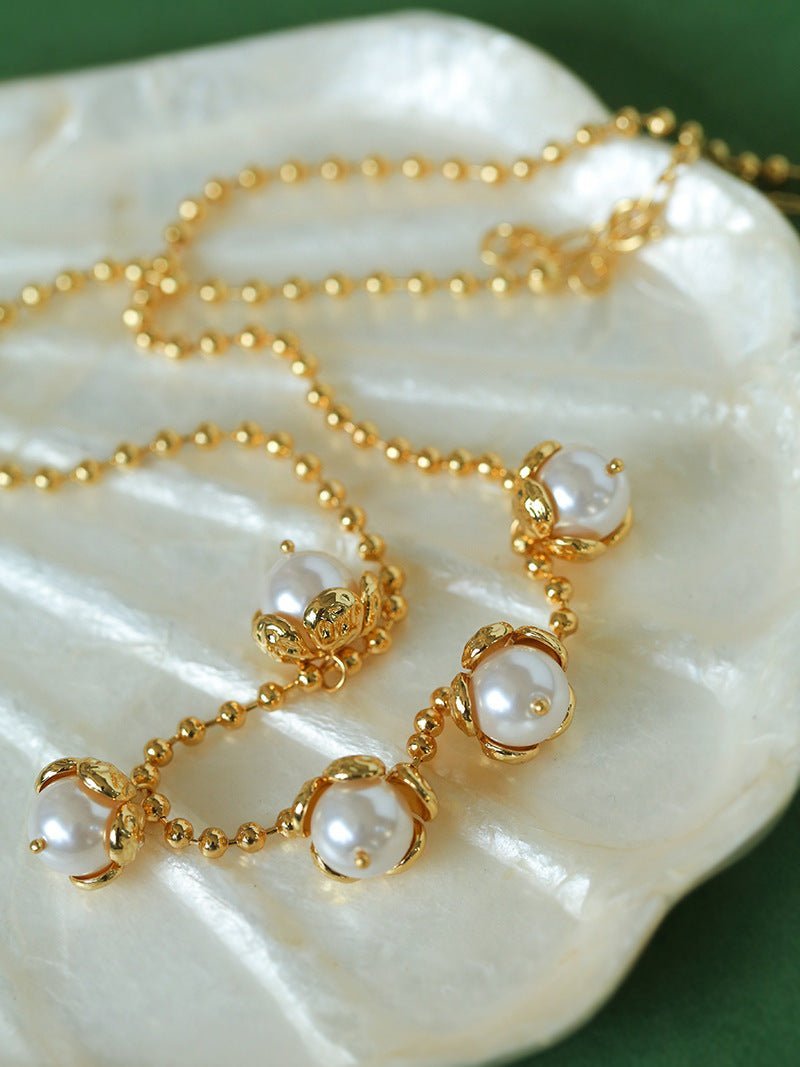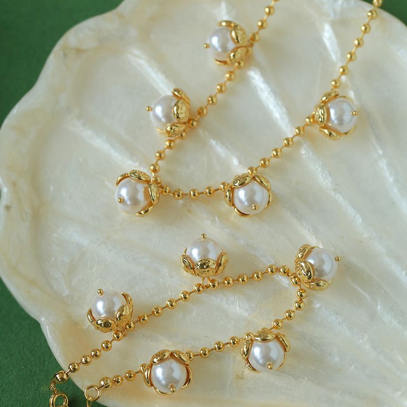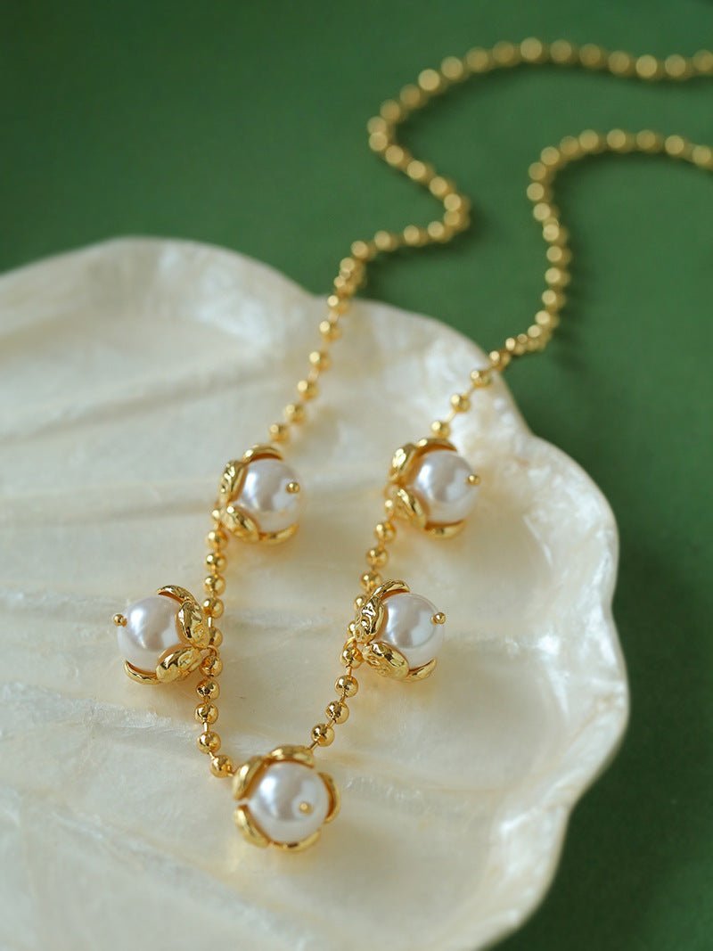 This ensemble exudes a touch of vintage European and American charm, embodying classic design elements with a modern twist. Such designs often seek to harmonize the beauty of nature with the elegance of pearl and chain combinations.