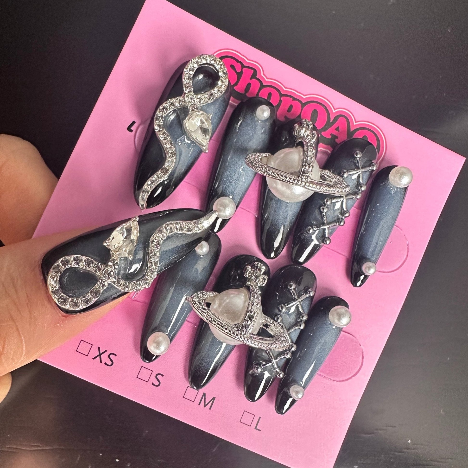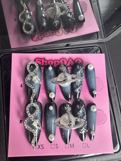 Embrace the fierce allure of the Empress Serpent Press-On Nails. These handcrafted, long nails feature intricate metal snake designs and a cyberpunk aesthetic that exudes boldness and sophistication. Perfect for those who want to make a powerful statement, these nails combine edgy elements with a touch of high fashion.
