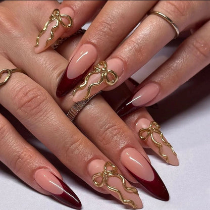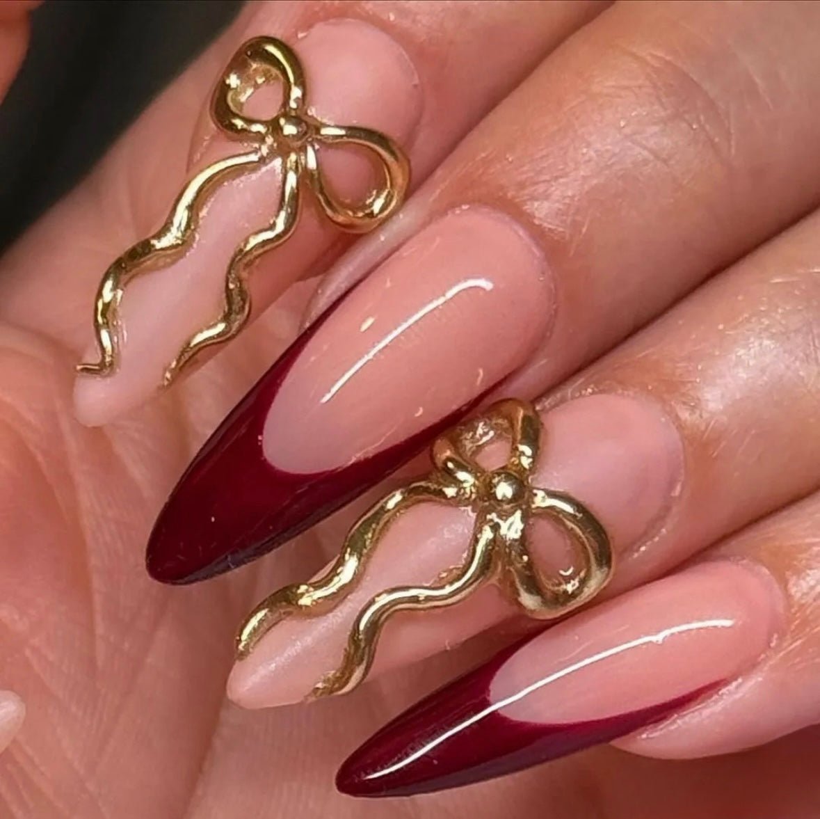 • Gold Bow Accents: Adorned with delicate gold bows, these nails provide a glamorous and eye-catching touch that elevates your style.