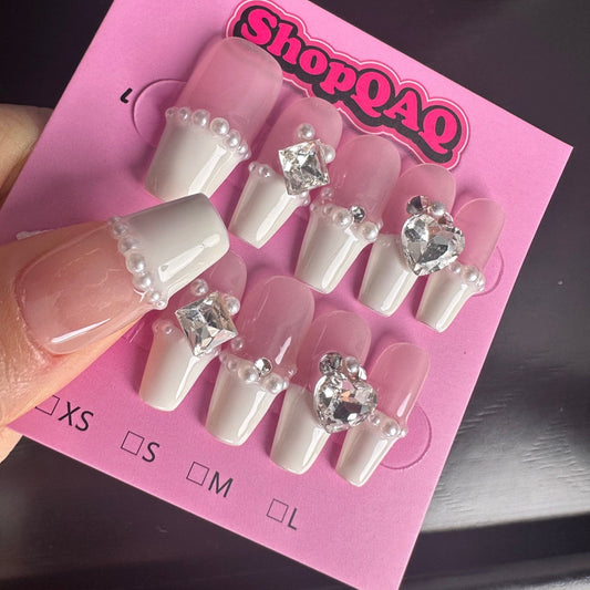 Elegant Pearl-Embellished French Manicure Press-On Nails – Handcrafted Off-White Bridal Collection