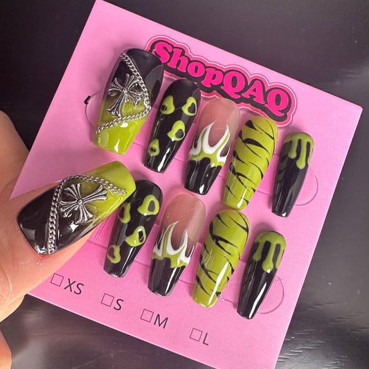Green Flame" Handcrafted Press-On Nails – Forest Elf Green, Brightening Hand-Painted Design