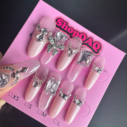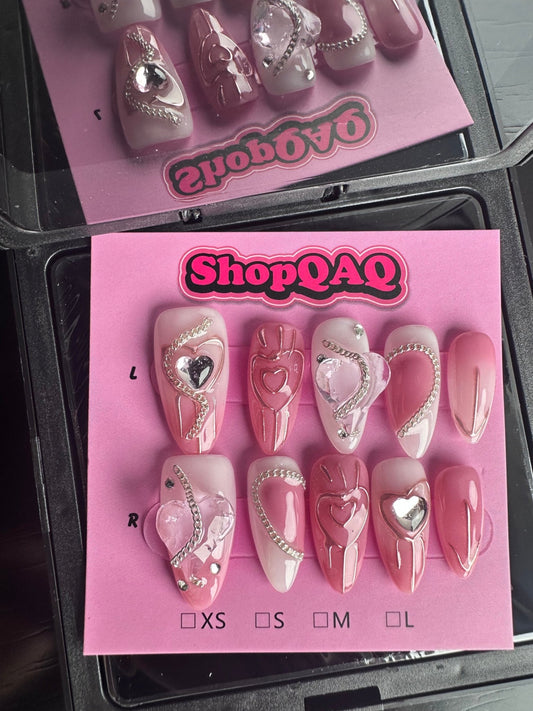 Heart Bubble French Alloy Steel Bead Chain Angel Gown Press-On Nails – Handcrafted, Exquisite, and Elegant