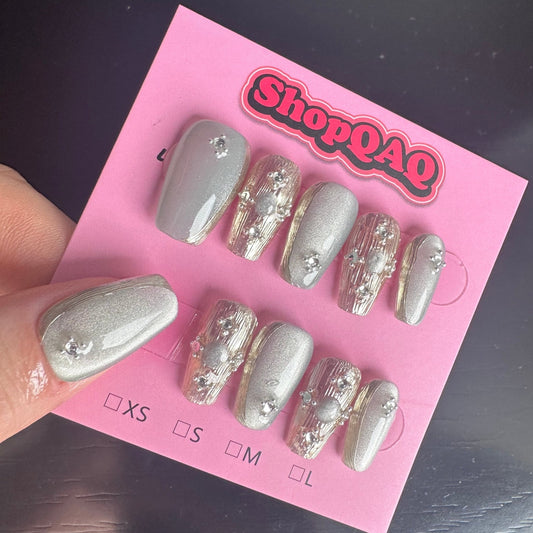Silver Wing Maiden | Bucciarati Glass Bead Cat Eye Metallic Bad Girl Style Mechanical Press-On Gel Nails"