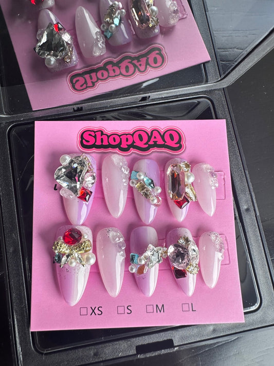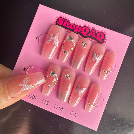 Here's a product description for your nail design: "2024 New Year Crystal Butterfly Nails | Sweetheart Girl, Gentle & Clear, White-Enhancing Handcrafted Press-On Nails with Cat Eye and Blush Accents"