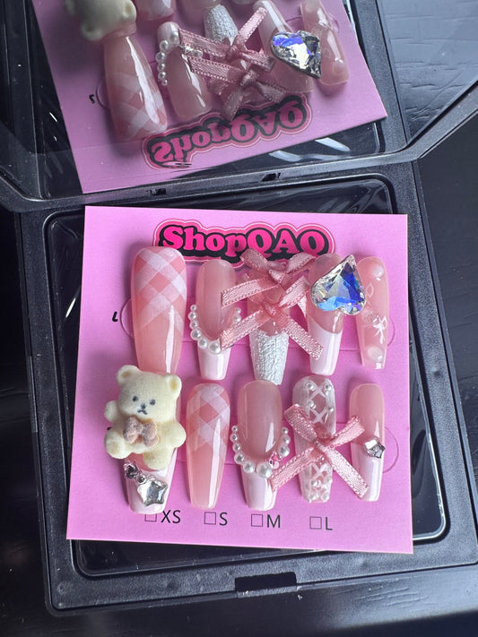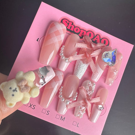 Sweetheart Ballerina | Handcrafted Press-On Nails – Cute Bear, Ballet Ribbon, French Style, High-End, Niche Elegance
