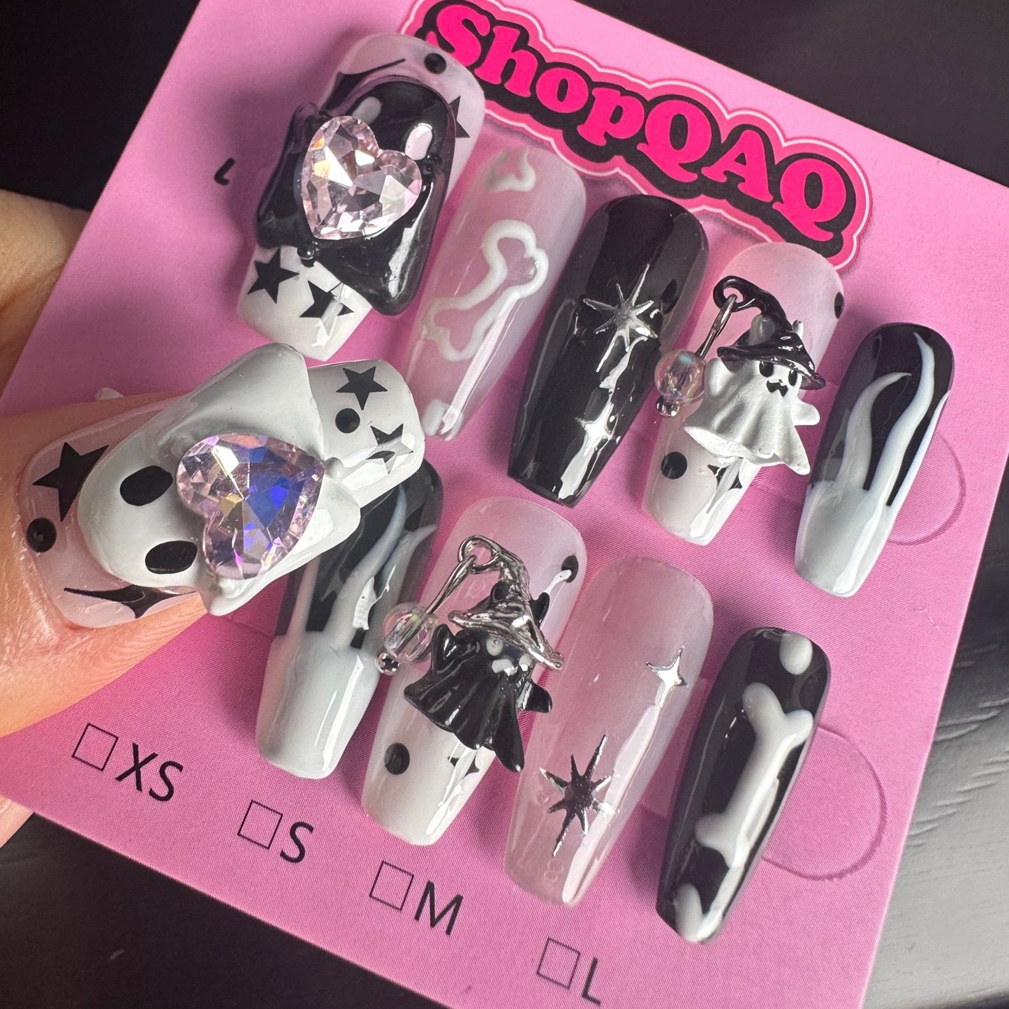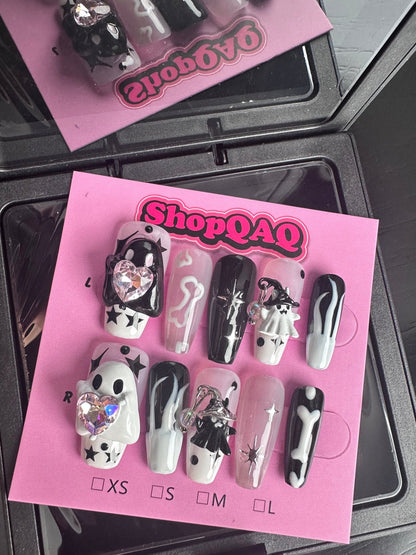 • Hand-Painted Art: Each nail is individually hand-painted with adorable ghost designs, showcasing intricate details and unique artistry that set them apart from mass-produced nails.