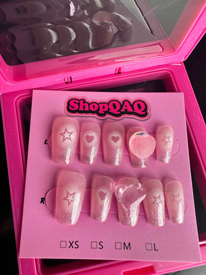 Discover the elegance of our "Beating Heart" Handcrafted Press-On Nails, featuring a sophisticated pink heart design with a subtle cat eye effect. These nails are perfect for those who love a minimalist yet high-end look, offering a brightening effect that enhances your natural beauty. Ideal for any occasion, these nails are easy to apply, removable, and reusable.