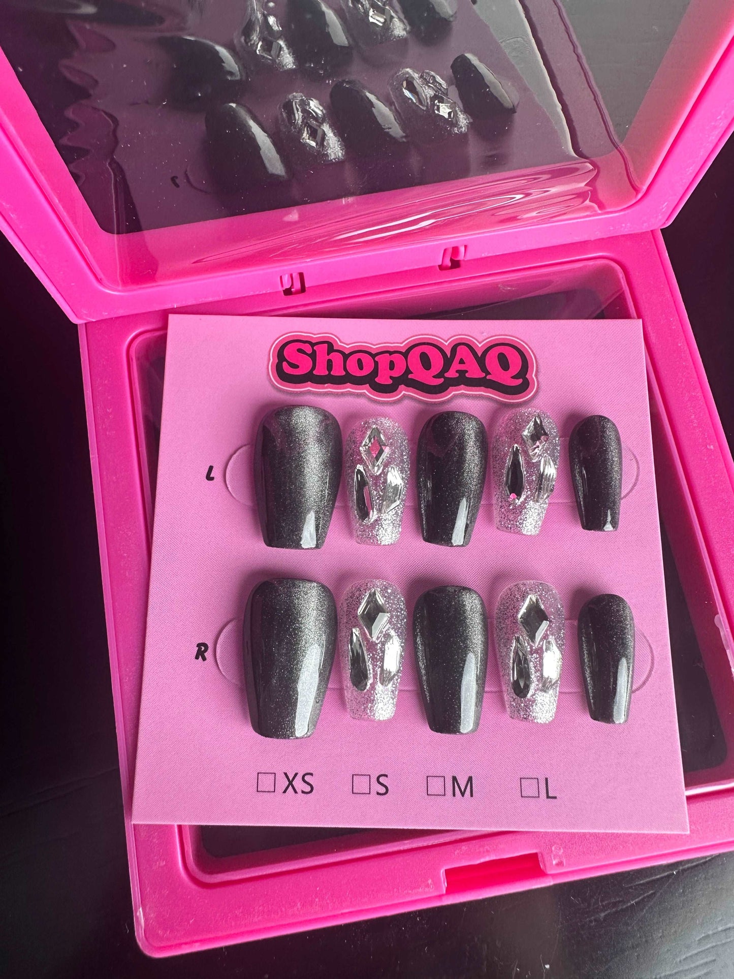 Elevate your nail style with our "Celestial Summit" Crystal Cat Eye Press-On Nails. Featuring a captivating cat eye effect with a dark, gothic twist, these handcrafted nails are adorned with shimmering crystal accents. Designed for those who appreciate a unique, high-end look, these nails offer a striking contrast that brightens and enhances your natural beauty.