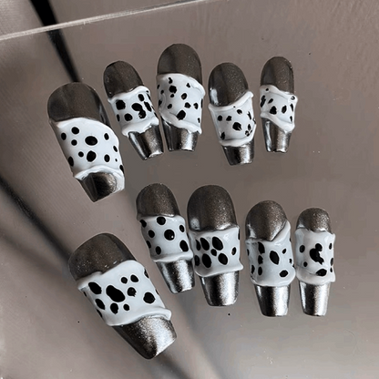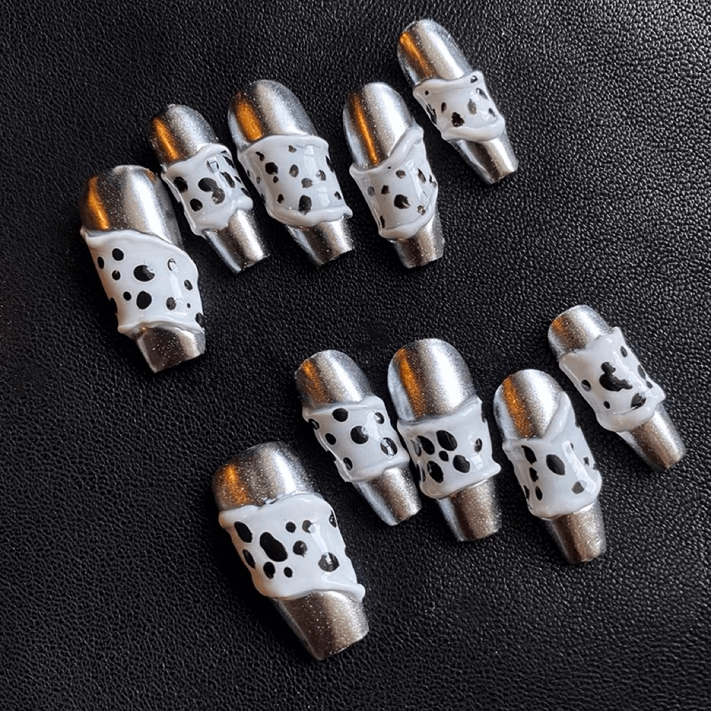 Introducing our striking collection, [Cyberpunk Cow], where retro meets futuristic! Get ready to rock the Y2K Millennium vibe with our black and white spice girl wearable nail art, featuring silver 3D original customization. These nails are designed to make a statement and turn heads wherever you go.