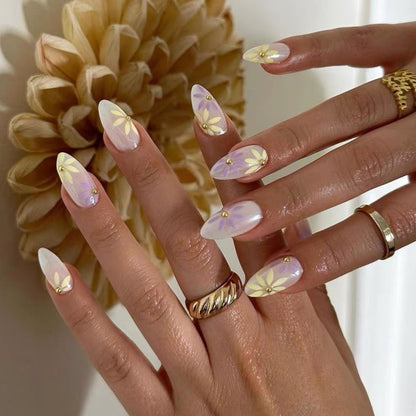 Enchanting Paris Collection, Hand-Painted Yellow Floral Design, Spring Almond French Manicure