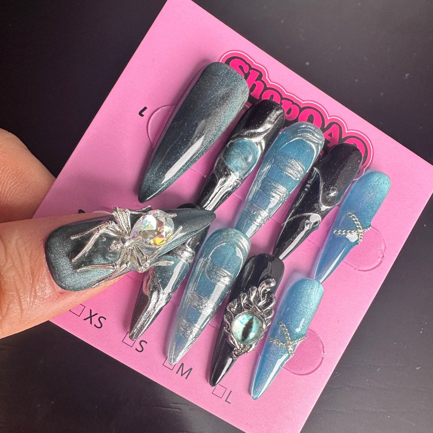 Embrace the dramatic allure of the Ethereal Gothic Glamour Press-On Nails. These long black nails combine a sweet and edgy aesthetic with intricate details, including waterdrop accents and spider motifs. Perfect for those who want to make a bold statement with a touch of gothic sophistication.