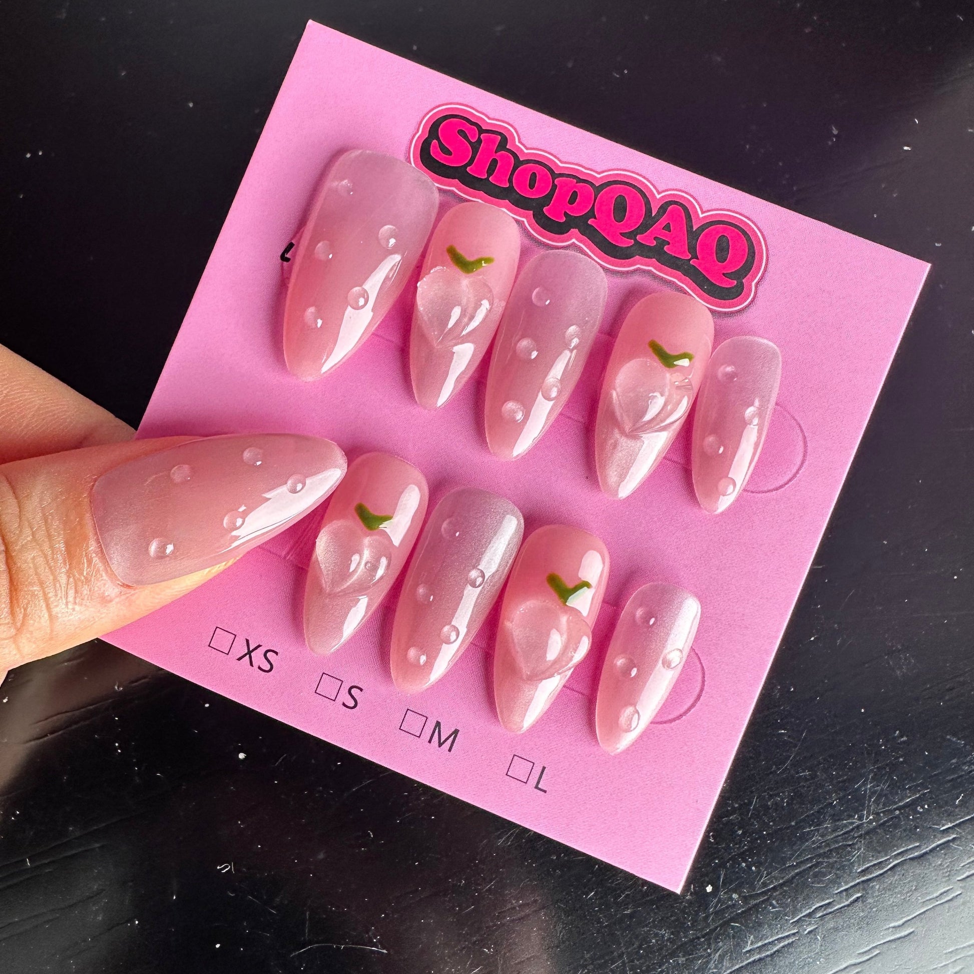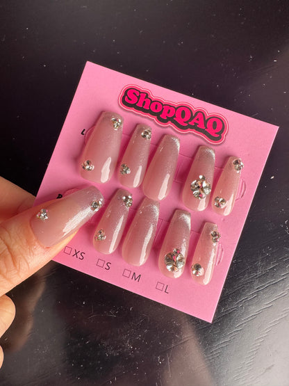Experience the refreshing charm of our "Icy Peach" Handcrafted Press-On Nails. These short, dewy pink nails are designed to enhance your natural beauty with their brightening effect and delicate, youthful hue. Perfect for achieving a fresh and feminine look, these nails feature a unique dewdrop finish that adds a touch of elegance and sophistication.