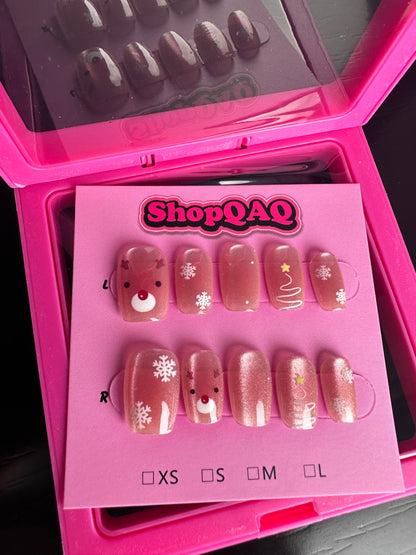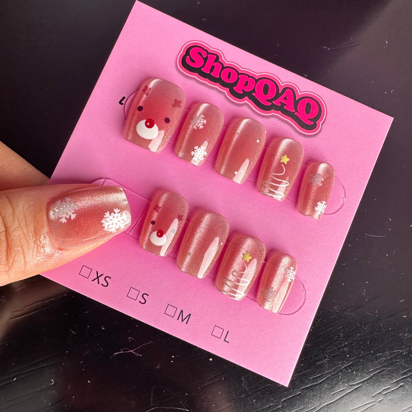Celebrate the holiday season with our Snowflake Reindeer Christmas Cat Eye Handcrafted Press On Nails. These stunning nails are meticulously hand-painted, featuring a delightful combination of festive snowflakes and reindeer motifs that perfectly capture the spirit of Christmas. The enchanting cat eye effect adds a magical, shimmering quality that changes with the light, creating a dynamic and eye-catching appearance.