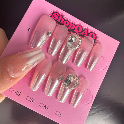 Product Overview: Elevate your nail game with the Enchanting Elegance Press-On Nails, inspired by the captivating style of Hailey. These hand-crafted nails feature a stunning white moonlight shimmer with sparkling diamonds, designed to create an unforgettable impression.