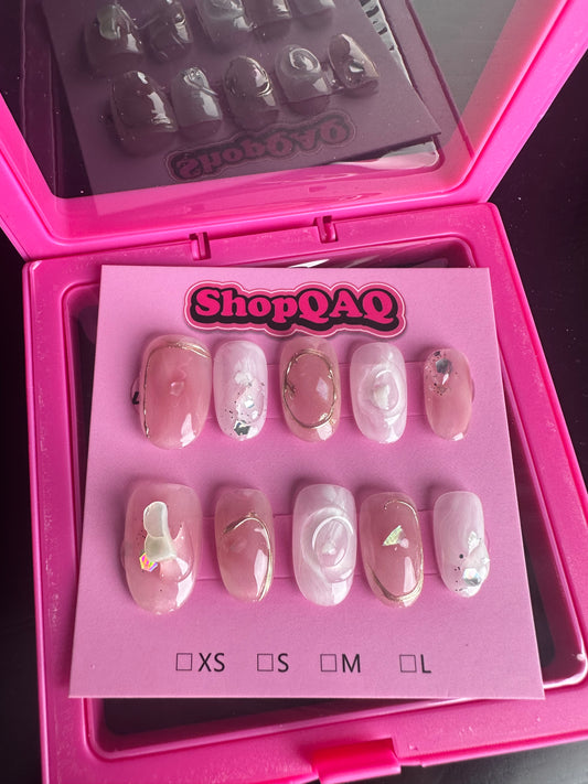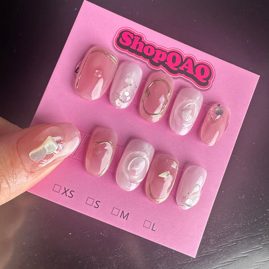 Almond-Shaped Pink & White Brushstroke Sparkling Minimalist Handcrafted Press-On Nails