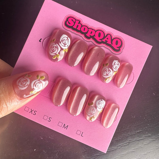 Spring Rose" Hand-Painted Cat Eye Press-On Nails