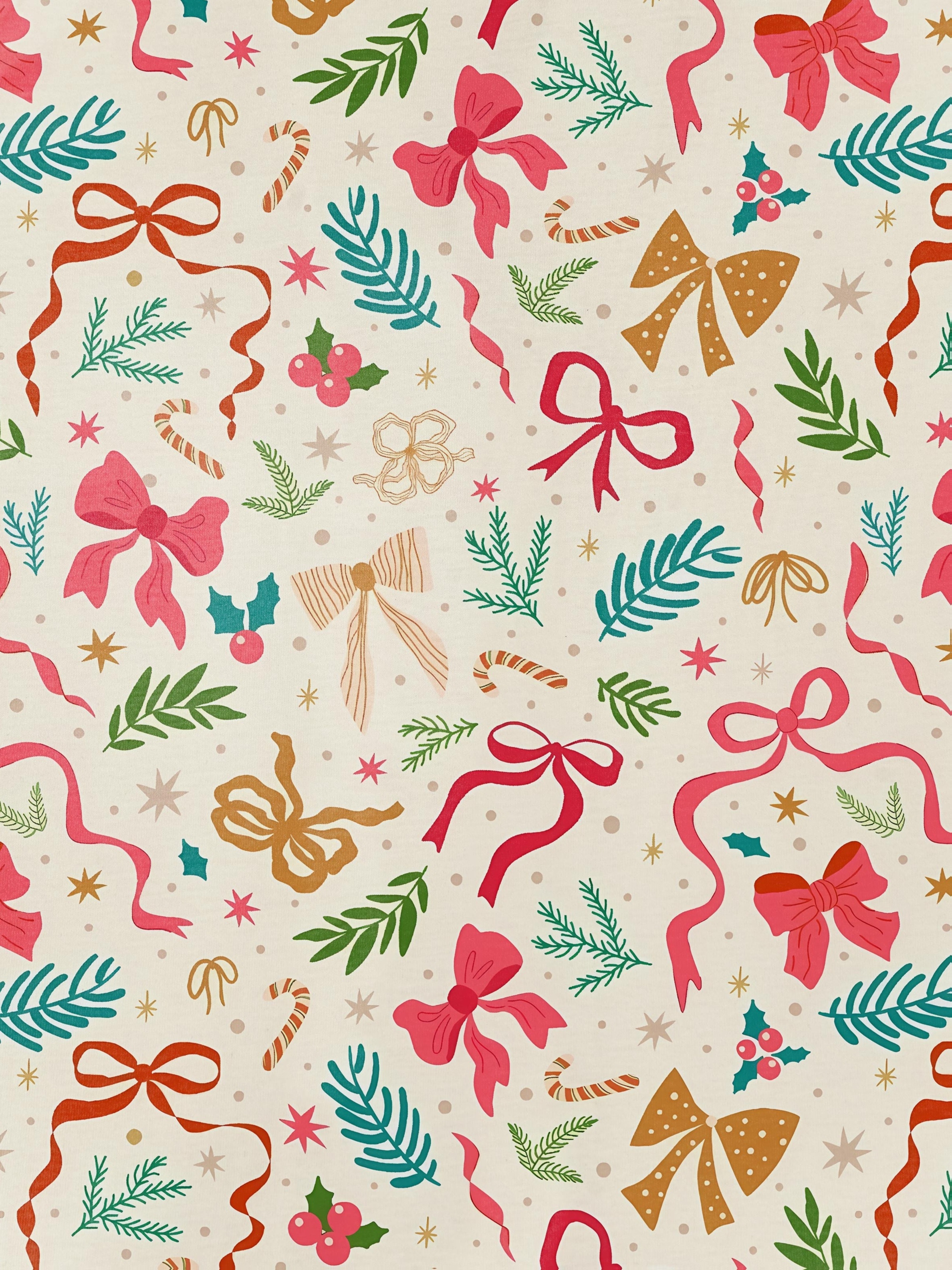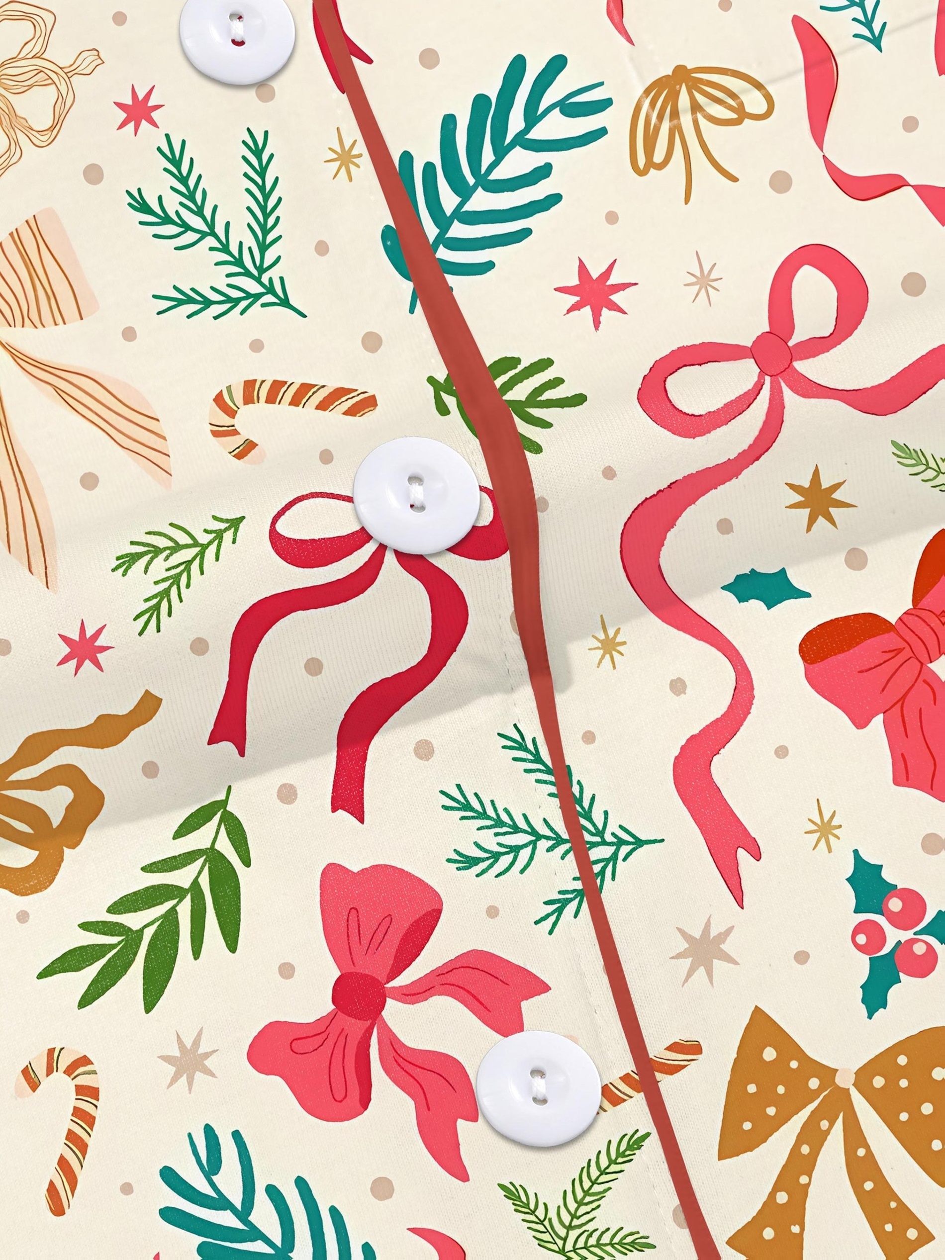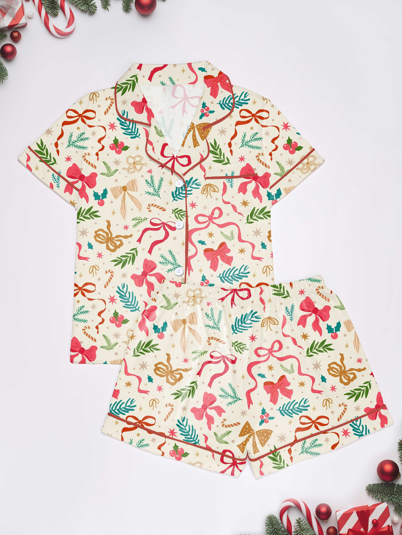 Cream Holiday Ribbon Cotton Pajama Set — Short-Sleeve Top & Shorts