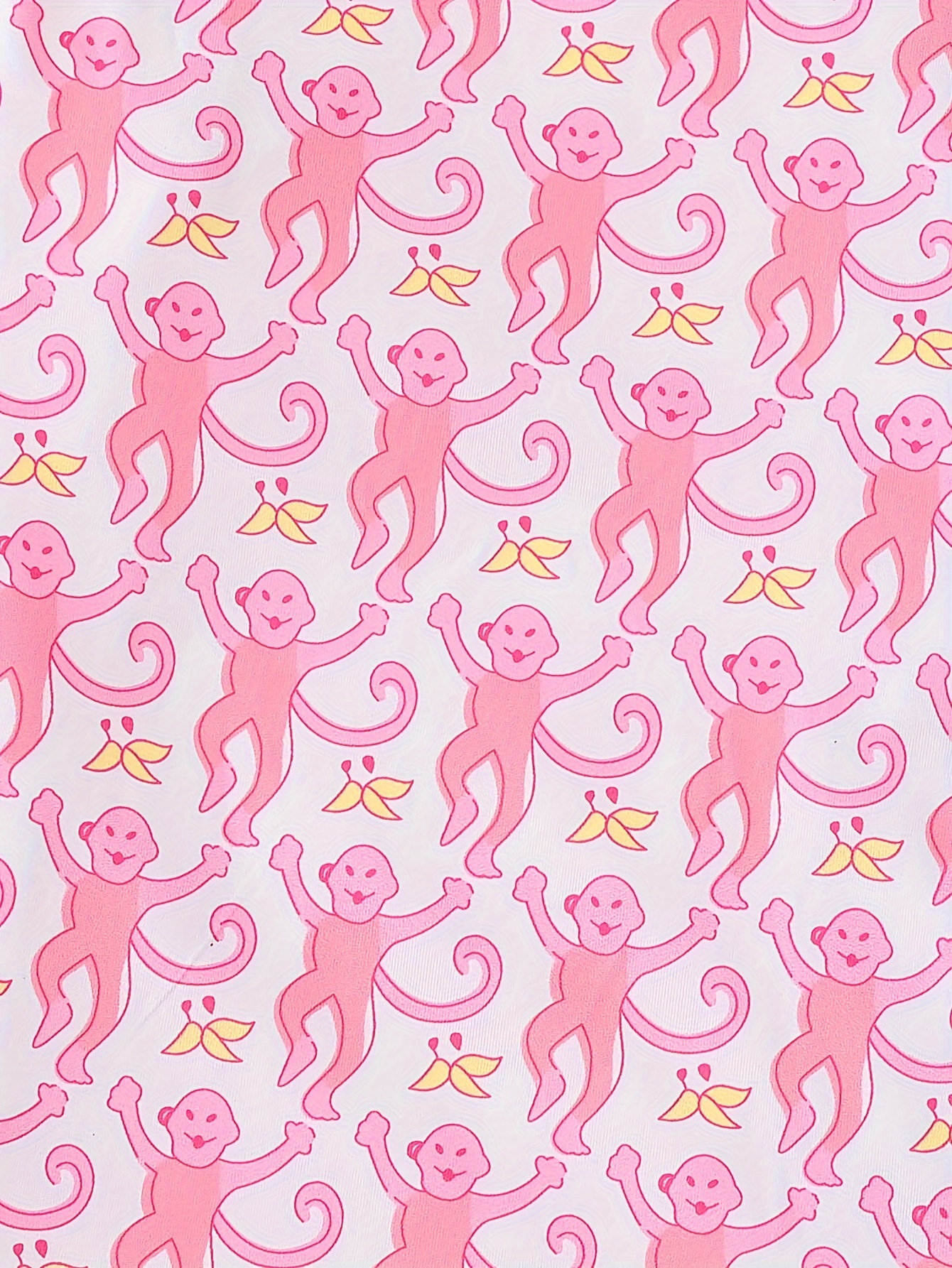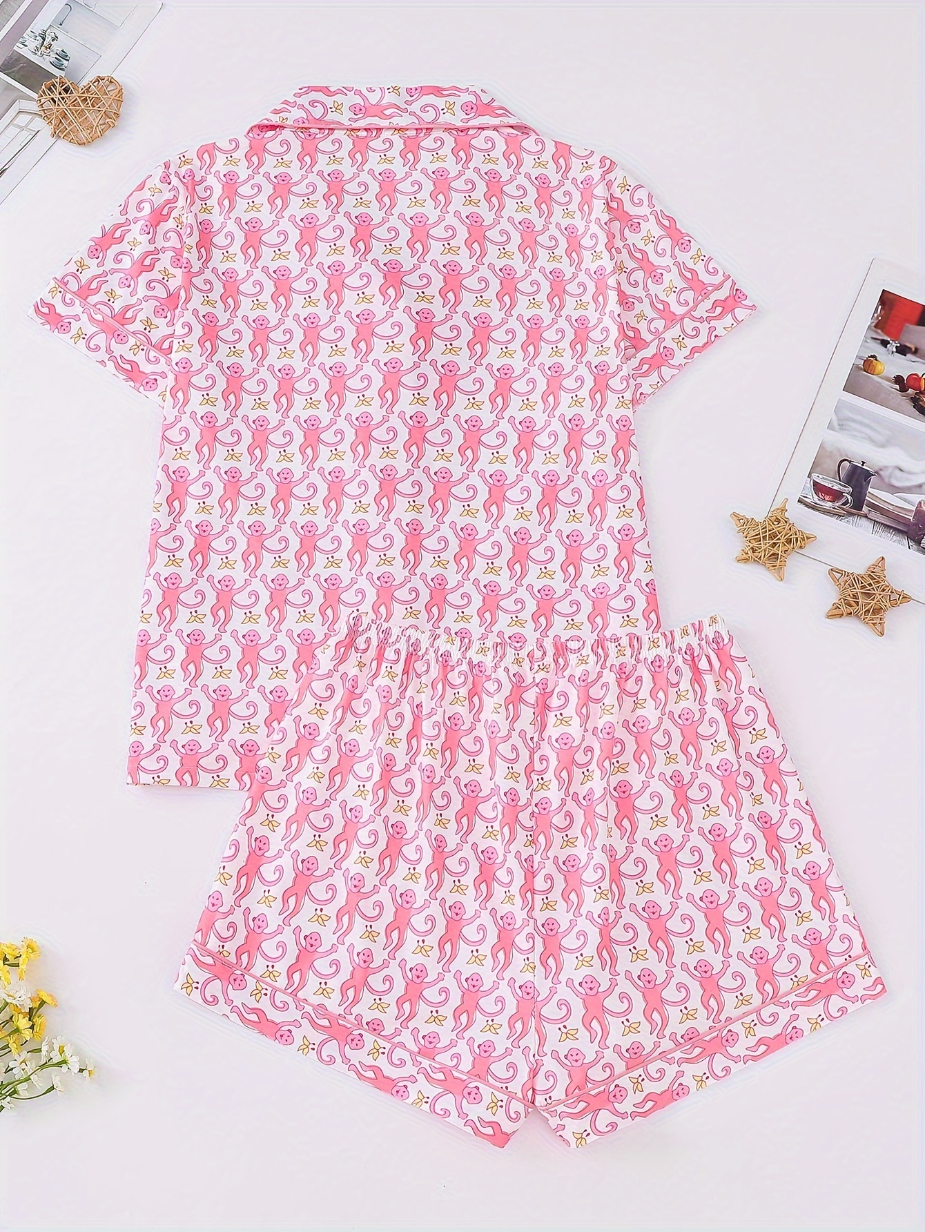 Wake up smiling in this Playful Pink Monkey satin-look pajama set — a cheerful, youthful print of tiny pink monkeys and little bananas dances across a crisp white ground for an instant mood boost. The set includes a short-sleeve, button-up top with a neat chest pocket and elastic-waist shorts finished with slender piping for a tidy, polished look. The satin-look fabric (95% Polyester / 5% Elastane) feels cool and silky against skin with a touch of stretch, perfect for warm nights, sleepovers, or lounging on slow weekend mornings.