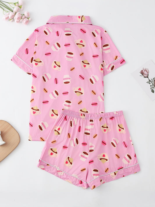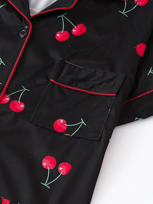 Pink Cherry Satin-Look Short Sleeve Pajama Set