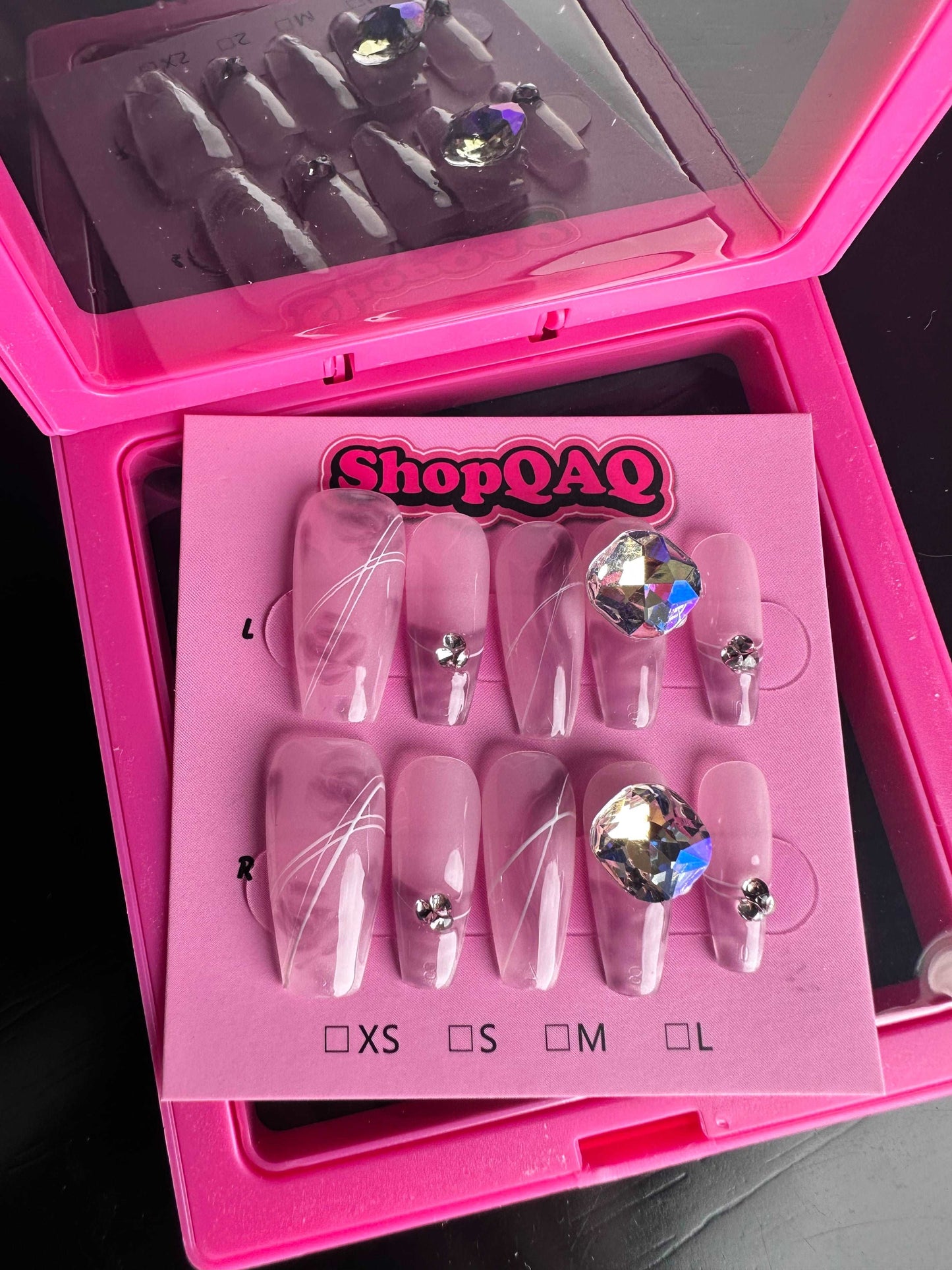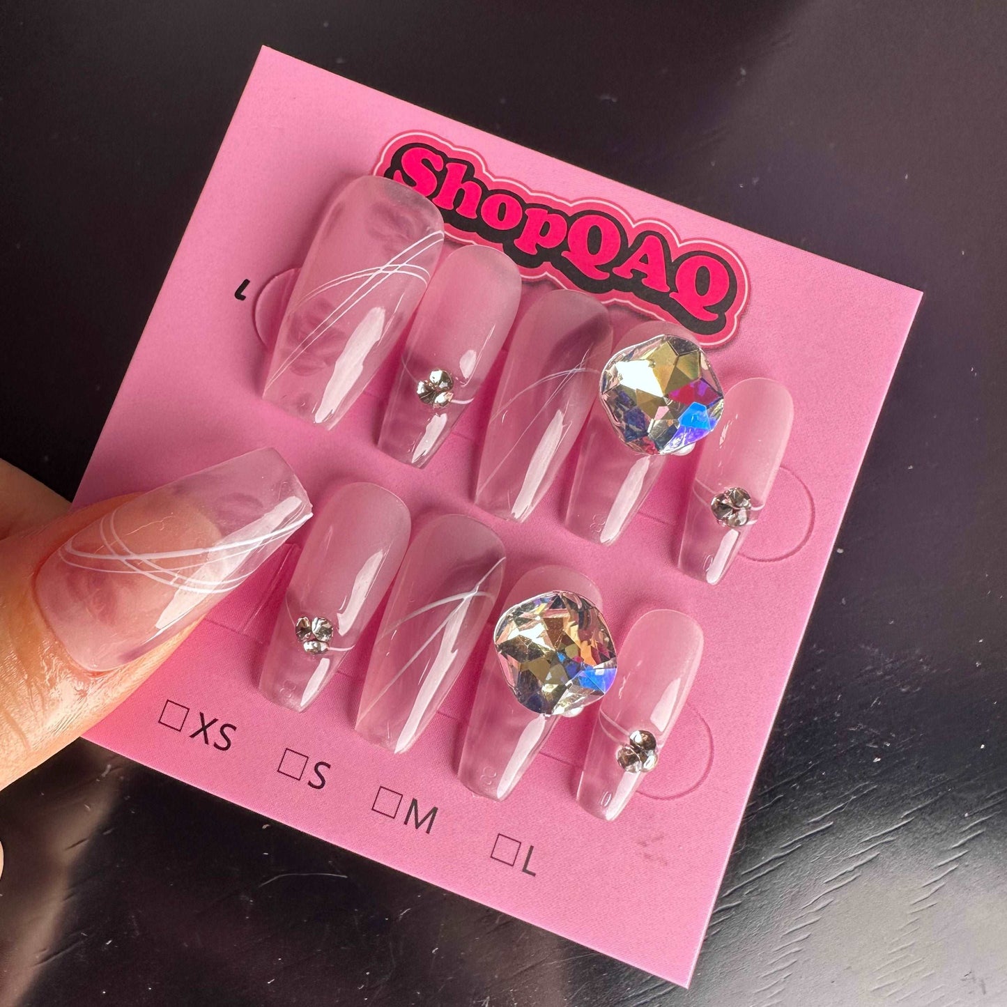 Bauhinia Rose Swarovski Crystal Long Coffin Press On Nails – Luxurious & Glamorous