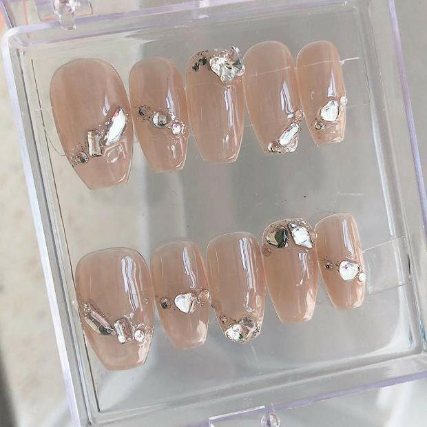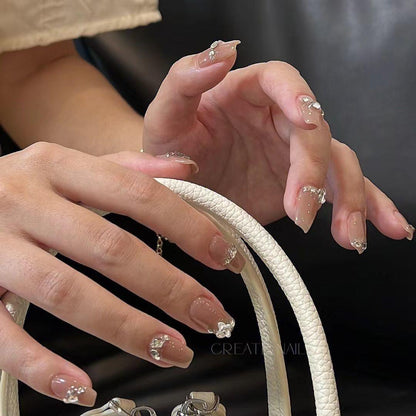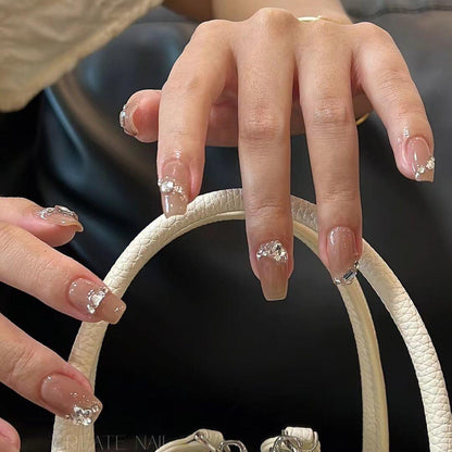 Handmade False Nails Nude Color Shiny Shaped Diamond Small Butterfly Nail Art is the perfect accessory to add some sparkle to your look. These stunning nails are meticulously crafted by hand with a nude color base and adorned with shimmering diamond accents and cute small butterfly details. The nails are designed with a unique shape that will perfectly complement any outfit, making them ideal for a night out or a special occasion. These false nails are easy to apply and remove, and can be reused multiple times, providing excellent value for money. Elevate your nail game with these exquisite handmade false nails!